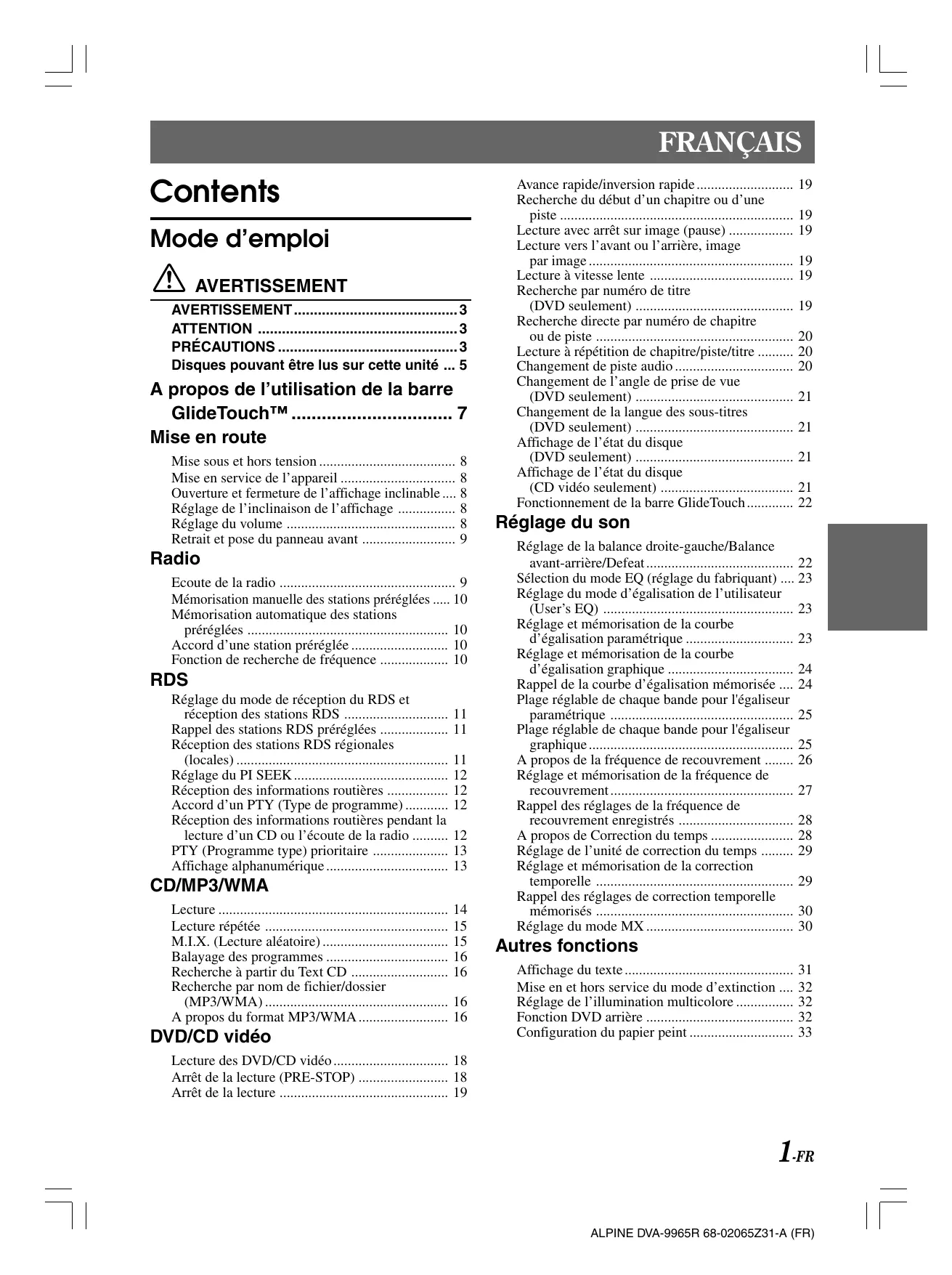 - « La fourniture de ce produit ne confère qu’une licence pour une utilisation privée de nature non commerciale, mais ne confère aucune licence et n’implique aucun droit d’utiliser ce produit pour une diffusion commerciale (c’est-à-dire générant des recettes) en temps réel (par voie terrestre, satellite, câble et/où tout autre support), une diffusion/lecture en transit via Internet, des intranets et/où autres réseaux ou sur tout autre système de distribution de contenu électronique tel que les applications audio à péage où à la demande. Une licence indépendante est requise pour ce type d’utilisation. Pour de plus amples détails, visitez le site http://www. mp3licensing.com. » 6-FR ALPINE DVA-9965R 68-02065Z31-A (FR) A propos de l’utilisation de la barre GlideTouch™