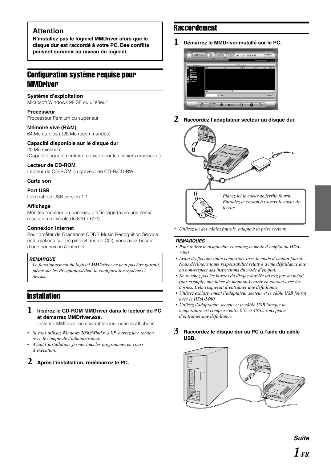 Lecteur de CD-ROM Lecteur de CD-ROM ou graveur de CD-R/CD-RW Carte son Port USB Placez ici le coeur de ferrite fourni. Enroulez le cordon à travers le coeur de ferrite. Compatible USB version 1.1 Affichage Moniteur couleur ou panneau d’affichage (avec une zone/ résolution minimale de 800 x 600) Connexion Internet Pour profiter de Gracenote CDDB Music Recognition Service (informations sur les pistes/titres de CD), vous avez besoin d’une connexion à Internet. REMARQUE Le fonctionnement du logiciel MMDriver ne peut pas être garanti, même sur les PC qui possèdent la configuration système cidessus. Installation