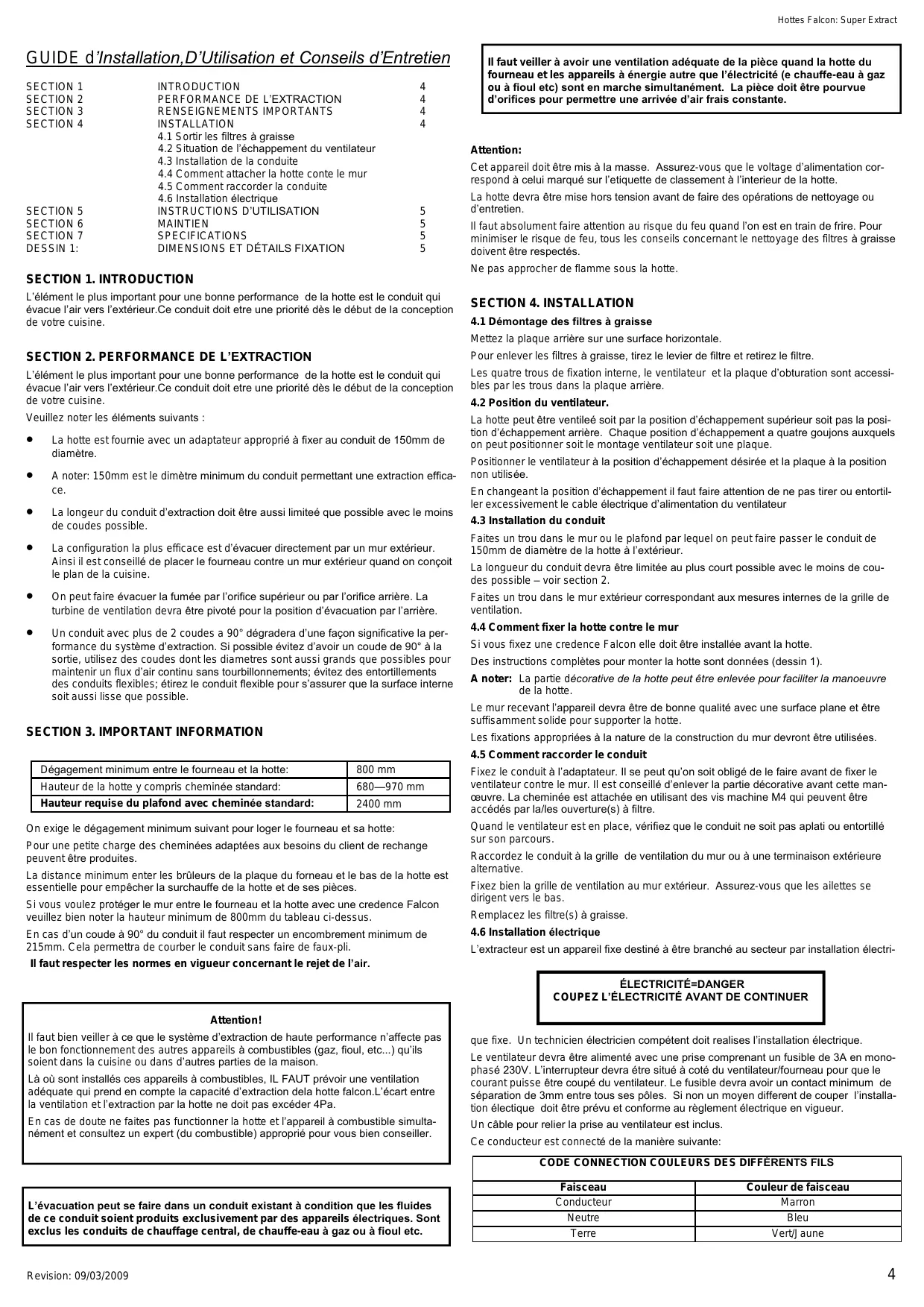 Là où sont installés ces apparueils à combustibles, IL FAUT prévoir une ventilation dééquate qui prend en compte la capacité d'extraction dela hotte falcon. L'écart entre la ventilation et l'extraction par la hotte ne doit pas exceder 4Pa.