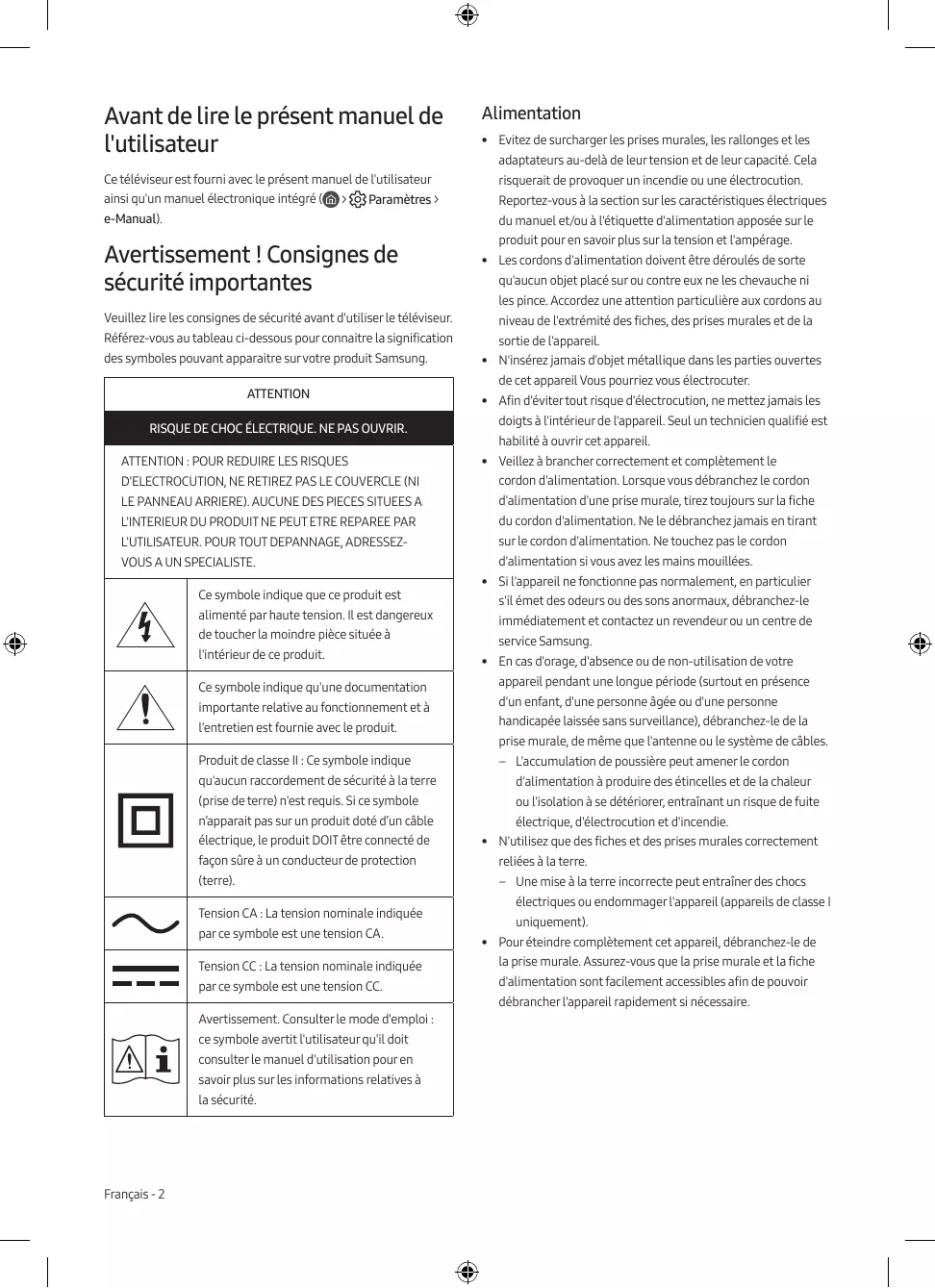 Paramètres > e-Manual). du manuel et/ou à l'étiquette d'alimentation apposée sur le Avertissement ! Consignes de sécurité importantes Veuillez lire les consignes de sécurité avant d'utiliser le téléviseur. Référez-vous au tableau ci-dessous pour connaitre la signification des symboles pouvant apparaitre sur votre produit Samsung. ATTENTION RISQUE DE CHOC ÉLECTRIQUE. NE PAS OUVRIR.