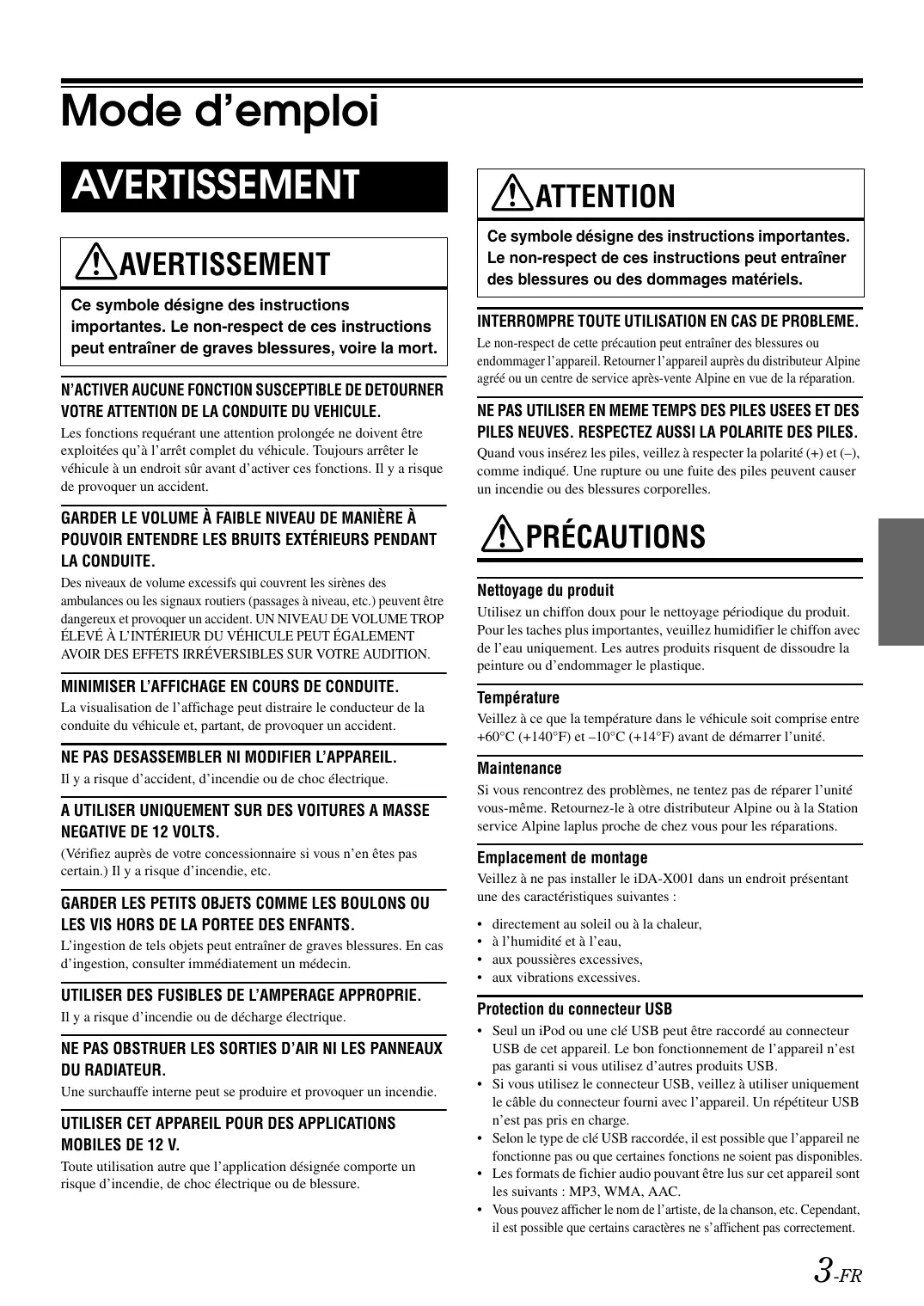 MOBILES DE 12 V. Toute utilisation autre que l’application désignée comporte un risque d’incendie, de choc électrique ou de blessure. PRÉCAUTIONS Nettoyage du produit Utilisez un chiffon doux pour le nettoyage périodique du produit. Pour les taches plus importantes, veuillez humidifier le chiffon avec de l’eau uniquement. Les autres produits risquent de dissoudre la peinture ou d’endommager le plastique. Température Veillez à ce que la température dans le véhicule soit comprise entre +60°C (+140°F) et –10°C (+14°F) avant de démarrer l’unité. Maintenance Si vous rencontrez des problèmes, ne tentez pas de réparer l’unité vous-même. Retournez-le à otre distributeur Alpine ou à la Station service Alpine laplus proche de chez vous pour les réparations. Emplacement de montage Veillez à ne pas installer le iDA-X001 dans un endroit présentant une des caractéristiques suivantes :