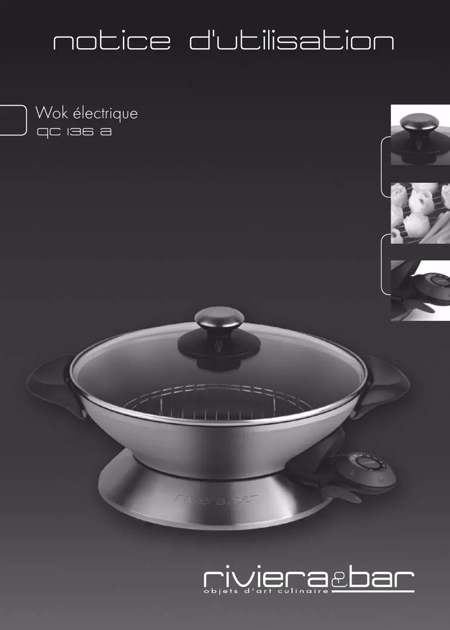 notice d'utilisation Wok électrique qc 136 a Avec cet appareil, vous avez fait l’acquisition d’un article de qualité, bénéficiant de toute l’expérience de Riviera & Bar dans le domaine de la cuisson. Il répond aux critères de qualité Riviera & Bar : les meilleurs matériaux et composants ont été utilisés pour sa fabrication, et il a été soumis à des contrôles rigoureux. Nous souhaitons que son usage vous apporte entière satisfaction. Nous vous demandons de lire très attentivement les instructions indiquées dans cette notice, car elles fournissent, entre autres, des informations importantes relatives à la sécurité d’installation, d’utilisation et d’entretien. Gardez votre notice, vous pourriez avoir besoin de vous y référer dans le futur. sommaire Description du produit