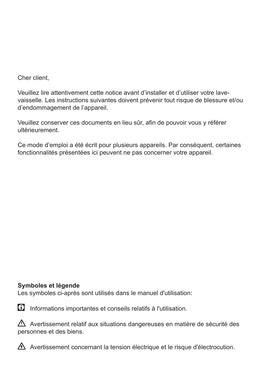 1 Touche Marche/ Arrêt 2 Voyant de l'indicateur de niveau de liquide de rinçage 3 Voyant de l’indicateur de niveau de sel 4 Touche Départ / Annulation 5 Bouton de sélection du programme 6 Voyants led de l’indicateur de progression Pour changer la sélection de programmes pendant le fonctionnement de la machine, ouvrir la porte. ! Faire attention au moment d’ouvrir la porte, car la vapeur risque de s’échapper. Appuyer sur la touche Marche/Annulation. Le voyant lumineux s’éteindra. Sélectionner le nouveau program. Appuyer sur la touche Marche/ Annulation. Le voyant lumineux sera allumé. Un nouveau program sera lancé à la fermeture de la porte. Important: Le nouveau programme NE commencera pas au tout début. Au contraire, il commencera à partir de l’étape où s’est arrêtée la précédente sélection de programmes. ! Avertissement Selon la longueur du program interrompu le détergent et le produit de rinçage peuvent encore se trouver dans les distributeurs Chargement incorrect de la vaisselle Il vous suffit également de regarder le distributeur de produit de rinçage pour savoir si vous devez rajouter du produit de rinçage. Lorsque l’indicateur visuel de remplissage est sombre, cela signifie qu’il y a suffisamment de produit de rinçage dans le distributeur. Lorsqu’il est clair, ouvrez le distributeur et rajoutez du produit de rinçage. Boutons Sélection de programmes Utiliser le bouton de sélection de programmes pour sélectionner le program souhaité. Le voyant de program correspondant s’allume. Bouton Départ / Annulation Cette touche sert à lancer le programme choisi ; le voyant sur la touche s'allume. Arrêtez le programme avec la bouton départ / annulation si vous souhaitez ouvrir la porte pendant le programme de lavage. Comment annuler le program de lavage Pour annuler un program lorsque la machine est en marche: Ouvrir la porte ! Faire attention au moment d’ouvrir la porte, car la vapeur risque de s’échapper. Appuyer sur le bouton Départ / Annulation pendant 3 secondes. Le Voyant lumineux Départ / Annulation commencera à clignoter. Fermer la porte. L’appareil drainera l’eau à l’intérieur de la machine pendant 45 secondes. Le program est annulé lorsque le voyant de l'indicateur Départ / Annulation s’éteint. Vous pouvez alors choisir et lancer un nouveau program. ! Important: Suivant l’étape du program que vous avez annulé, il peut y avoir des résidus de détergent ou de produit de rinçage à l’intérieur de la machine et sur la charge. S’assurer que les éléments qui se trouvent à l’intérieur du lave-vaisselle ne sont pas utilisés avant de bien nettoyer. Comment changer le program de lavage 17 2721 03 00-10 Lave-vaisselle Cher client, Veuillez lire attentivement cette notice avant d’installer et d’utiliser votre lavevaisselle. Les instructions suivantes doivent prévenir tout risque de blessure et/ou d’endommagement de l’appareil. Veuillez conserver ces documents en lieu sûr, afin de pouvoir vous y référer ultérieurement. Ce mode d’emploi a été écrit pour plusieurs appareils. Par conséquent, certaines fonctionnalités présentées ici peuvent ne pas concerner votre appareil. Symboles et légende Les symboles ci-après sont utilisés dans le manuel d'utilisation: Informations importantes et conseils relatifs à l'utilisation. Avertissement relatif aux situations dangereuses en matière de sécurité des personnes et des biens. Avertissement concernant la tension électrique et le risque d'électrocution. SOMMAİRE 1 Connaître votre appareil Présentation de l’appareil 2 Instructions de sécurité Avant l’installation Avant la première utilisation Sécurité des enfants Caractéristiques techniques Usage quotidien En cas de problèmes Ustensiles à ne pas laver au lavevaisselle 3 Sens de montage Remarques de sécurité pour l’installation Installation du lave-vaisselle Raccordement d’eau Raccordez le tuyau d’arrivée d’eau Vidange de l’eau Branchement électrique Mise au rebut 4 Utilisation de votre Lave-vaisselle