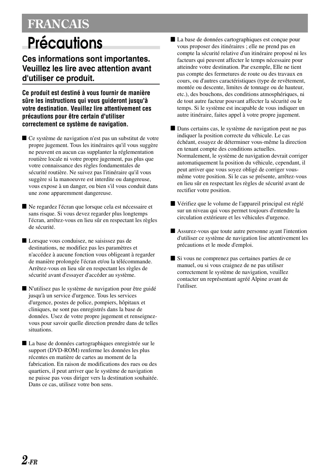 FRANCAIS Précautions Ces informations sont importantes. Veuillez les lire avec attention avant d'utiliser ce produit. Ce produit est destiné à vous fournir de manière sûre les instructions qui vous guideront jusqu'à votre destination. Veuillez lire attentivement ces précautions pour être certain d'utiliser correctement ce système de navigation. L Ce système de navigation n'est pas un substitut de votre propre jugement. Tous les itinéraires qu'il vous suggère ne peuvent en aucun cas supplanter la réglementation routière locale ni votre propre jugement, pas plus que votre connaissance des règles fondamentales de sécurité routière. Ne suivez pas l'itinéraire qu'il vous suggère si la manoeuvre est interdite ou dangereuse, vous expose à un danger, ou bien s'il vous conduit dans une zone apparemment dangereuse. L Ne regardez l'écran que lorsque cela est nécessaire et sans risque. Si vous devez regarder plus longtemps l'écran, arrêtez-vous en lieu sûr en respectant les règles de sécurité. L Lorsque vous conduisez, ne saisissez pas de destinations, ne modifiez pas les paramètres et n'accédez à aucune fonction vous obligeant à regarder de manière prolongée l'écran et/ou la télécommande. Arrêtez-vous en lieu sûr en respectant les règles de sécurité avant d'essayer d'accéder au système. L N'utilisez pas le système de navigation pour être guidé jusqu'à un service d'urgence. Tous les services d'urgence, postes de police, pompiers, hôpitaux et cliniques, ne sont pas enregistrés dans la base de données. Usez de votre propre jugement et renseignezvous pour savoir quelle direction prendre dans de telles situations. L La base de données cartographiques enregistrée sur le support (DVD-ROM) renferme les données les plus récentes en matière de cartes au moment de la fabrication. En raison de modifications des rues ou des quartiers, il peut arriver que le système de navigation ne puisse pas vous diriger vers la destination souhaitée. Dans ce cas, utilisez votre bon sens. 2-FR L La base de données cartographiques est conçue pour vous proposer des itinéraires ; elle ne prend pas en compte la sécurité relative d'un itinéraire proposé ni les facteurs qui peuvent affecter le temps nécessaire pour atteindre votre destination. Par exemple, Elle ne tient pas compte des fermetures de route ou des travaux en cours, ou d'autres caractéristiques (type de revêtement, montée ou descente, limites de tonnage ou de hauteur, etc.), des bouchons, des conditions atmosphériques, ni de tout autre facteur pouvant affecter la sécurité ou le temps. Si le système est incapable de vous indiquer un autre itinéraire, faites appel à votre propre jugement. L Dans certains cas, le système de navigation peut ne pas indiquer la position correcte du véhicule. Le cas échéant, essayez de déterminer vous-même la direction en tenant compte des conditions actuelles. Normalement, le système de navigation devrait corriger automatiquement la position du véhicule, cependant, il peut arriver que vous soyez obligé de corriger vousmême votre position. Si le cas se présente, arrêtez-vous en lieu sûr en respectant les règles de sécurité avant de rectifier votre position. L Vérifiez que le volume de l'appareil principal est réglé sur un niveau qui vous permet toujours d'entendre la circulation extérieure et les véhicules d'urgence. L Assurez-vous que toute autre personne ayant l'intention d'utiliser ce système de navigation lise attentivement les précautions et le mode d'emploi. L Si vous ne comprenez pas certaines parties de ce manuel, ou si vous craignez de ne pas utiliser correctement le système de navigation, veuillez contacter un représentant agréé Alpine avant de l'utiliser. Précautions concernant la sécurité a Veuillez lire attentivement les modes d'emploi du disque et de l'appareil avant d'utiliser le système de navigation. Ils expliquent comment l'utiliser de manière efficace et en toute sécurité. Alpine décline toute responsabilité quant aux problèmes dus au non respect des instructions fournies dans ces manuels. a Le manuel utilise différents symboles pour vous indiquer comment utiliser ce produit en toute sécurité et vous avertir des dangers potentiels résultant d'une mauvaise connexion ou manipulation. Voici la signification de ces symboles. Il est important de bien comprendre leur signification pour utiliser correctement le manuel et le système proprement dit. AVERTISSEMENT Ce symbole désigne des instructions importantes. Le non-respect de ces instructions peut entraîner de graves blessures, voire la mort.