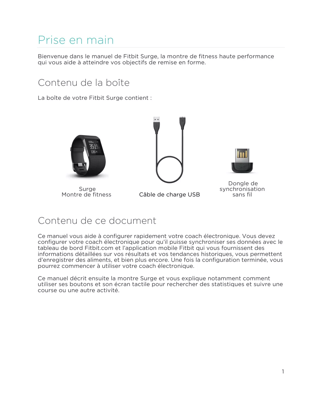 Prise en main Bienvenue dans le manuel de Fitbit Surge, la montre de fitness haute performance qui vous aide à atteindre vos objectifs de remise en forme. Contenu de la boîte La boîte de votre Fitbit Surge contient : Surge Montre de fitness Câble de charge USB Dongle de synchronisation sans fil Contenu de ce document Ce manuel vous aide à configurer rapidement votre coach électronique. Vous devez configurer votre coach électronique pour qu’il puisse synchroniser ses données avec le tableau de bord Fitbit.com et l’application mobile Fitbit qui vous fournissent des informations détaillées sur vos résultats et vos tendances historiques, vous permettent d’enregistrer des aliments, et bien plus encore. Une fois la configuration terminée, vous pourrez commencer à utiliser votre coach électronique. Ce manuel décrit ensuite la montre Surge et vous explique notamment comment utiliser ses boutons et son écran tactile pour rechercher des statistiques et suivre une course ou une autre activité.