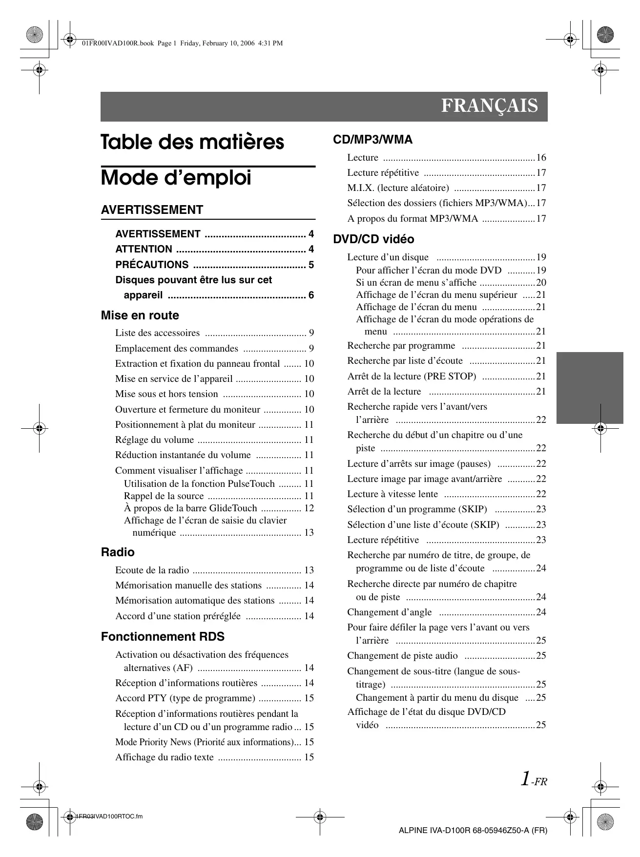 - 1-FR 01FR03IVAD100RTOC.fm ALPINE IVA-D100R 68-05946Z50-A (FR) 01FR00IVAD100R.book Page 2 Friday, February 10, 2006 4:31 PM Autres fonctions pratiques Réglage du son (Réglage des graves/aigus/de balance/du fader/du contour/du subwoofer/ NAV. LEVEL/Defeat) p. 26