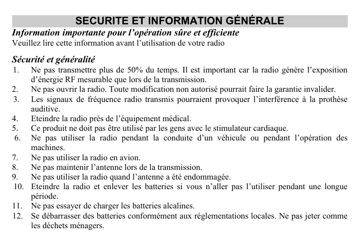 10. Eteindre la radio et enlever les batteries si vous n’aller pas l’utiliser pendant une longue