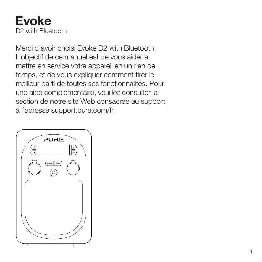 Merci d'avoir besoin Evoke D2 with Bluetooth. L'objet de ce manuel est de vous aider àmettre en service votre apparéil en un rien detempes, et de vous expliquer comment tirer lemeilleur parti de toutes ses fonctionnalités. Pourune aide complémentaire, veuillez consulter lasection de notre site Web consacrée au support,à l'adresse support.pure.com/fr.