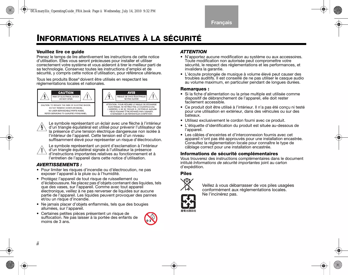 Toute modification non autorisée expressément par Bose Corporation est susceptible d'annuler le droit de l'utilisateur àmettre en œuvre celui-ci.