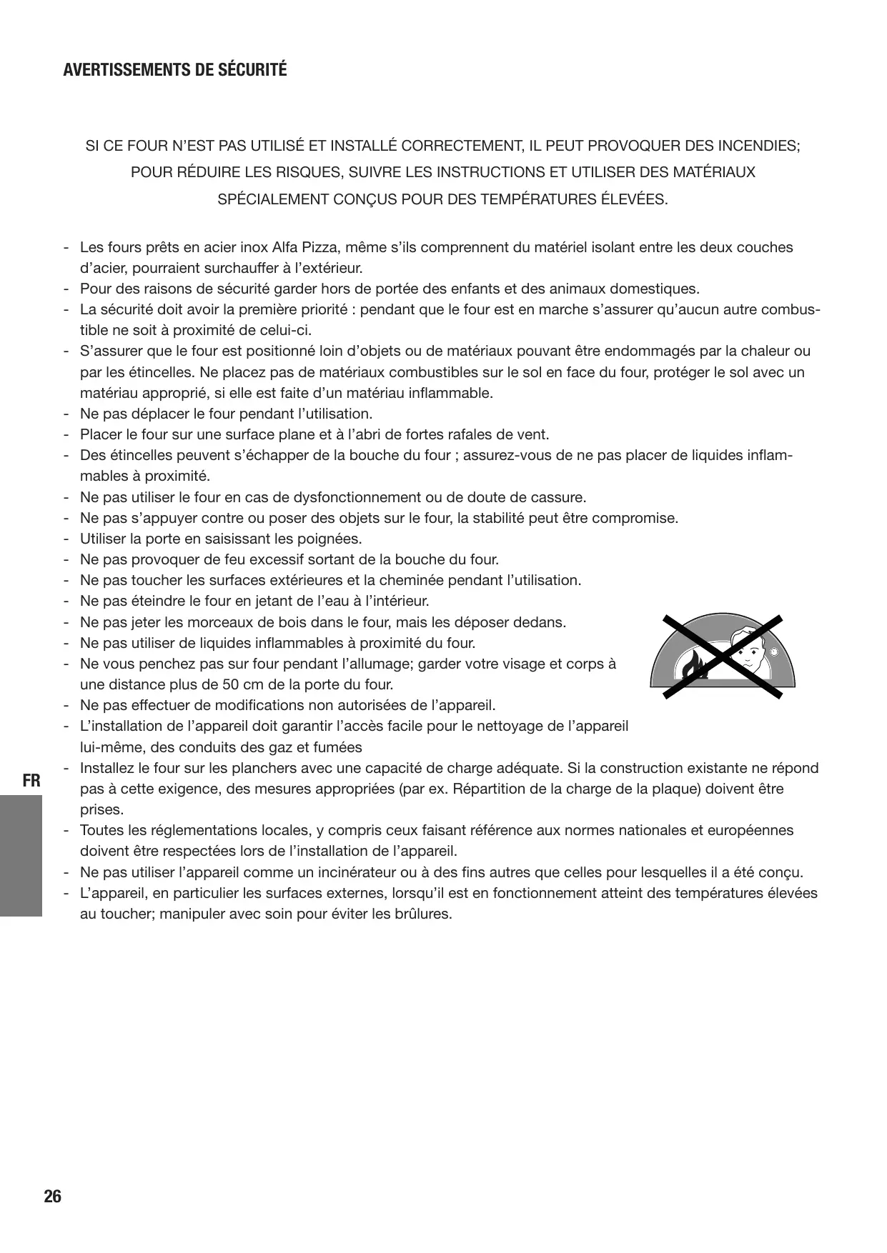 SI CE FOUR N’EST PAS UTILISÉ ET INSTALLÉ CORRECTEMENT, IL PEUT PROVOQUER DES INCENDIES; POUR RÉDUIRE LES RISQUES, SUIVRE LES INSTRUCTIONS ET UTILISER DES MATÉRIAUX SPÉCIALEMENT CONÇUS POUR DES TEMPÉRATURES ÉLEVÉES. -- Les fours prêts en acier inox Alfa Pizza, même s’ils comprennent du matériel isolant entre les deux couches d’acier, pourraient surchauffer à l’extérieur. -- Pour des raisons de sécurité garder hors de portée des enfants et des animaux domestiques. -- La sécurité doit avoir la première priorité : pendant que le four est en marche s’assurer qu’aucun autre combustible ne soit à proximité de celui-ci. -- S’assurer que le four est positionné loin d’objets ou de matériaux pouvant être endommagés par la chaleur ou par les étincelles. Ne placez pas de matériaux combustibles sur le sol en face du four, protéger le sol avec un matériau approprié, si elle est faite d’un matériau inflammable. -- Ne pas déplacer le four pendant l’utilisation. -- Placer le four sur une surface plane et à l’abri de fortes rafales de vent. -- Des étincelles peuvent s’échapper de la bouche du four ; assurez-vous de ne pas placer de liquides inflammables à proximité. -- Ne pas utiliser le four en cas de dysfonctionnement ou de doute de cassure. -- Ne pas s’appuyer contre ou poser des objets sur le four, la stabilité peut être compromise. -- Utiliser la porte en saisissant les poignées. -- Ne pas provoquer de feu excessif sortant de la bouche du four. -- Ne pas toucher les surfaces extérieures et la cheminée pendant l’utilisation. -- Ne pas éteindre le four en jetant de l’eau à l’intérieur. -- Ne pas jeter les morceaux de bois dans le four, mais les déposer dedans. -- Ne pas utiliser de liquides inflammables à proximité du four. -- Ne vous penchez pas sur four pendant l’allumage; garder votre visage et corps à une distance plus de 50 cm de la porte du four. -- Ne pas effectuer de modifications non autorisées de l’appareil. -- L’installation de l’appareil doit garantir l’accès facile pour le nettoyage de l’appareil lui-même, des conduits des gaz et fumées -- Installez le four sur les planchers avec une capacité de charge adéquate. Si la construction existante ne répond pas à cette exigence, des mesures appropriées (par ex. Répartition de la charge de la plaque) doivent être prises. -- Toutes les réglementations locales, y compris ceux faisant référence aux normes nationales et européennes doivent être respectées lors de l’installation de l’appareil. -- Ne pas utiliser l’appareil comme un incinérateur ou à des fins autres que celles pour lesquelles il a été conçu. -- L’appareil, en particulier les surfaces externes, lorsqu’il est en fonctionnement atteint des températures élevées au toucher; manipuler avec soin pour éviter les brûlures.
