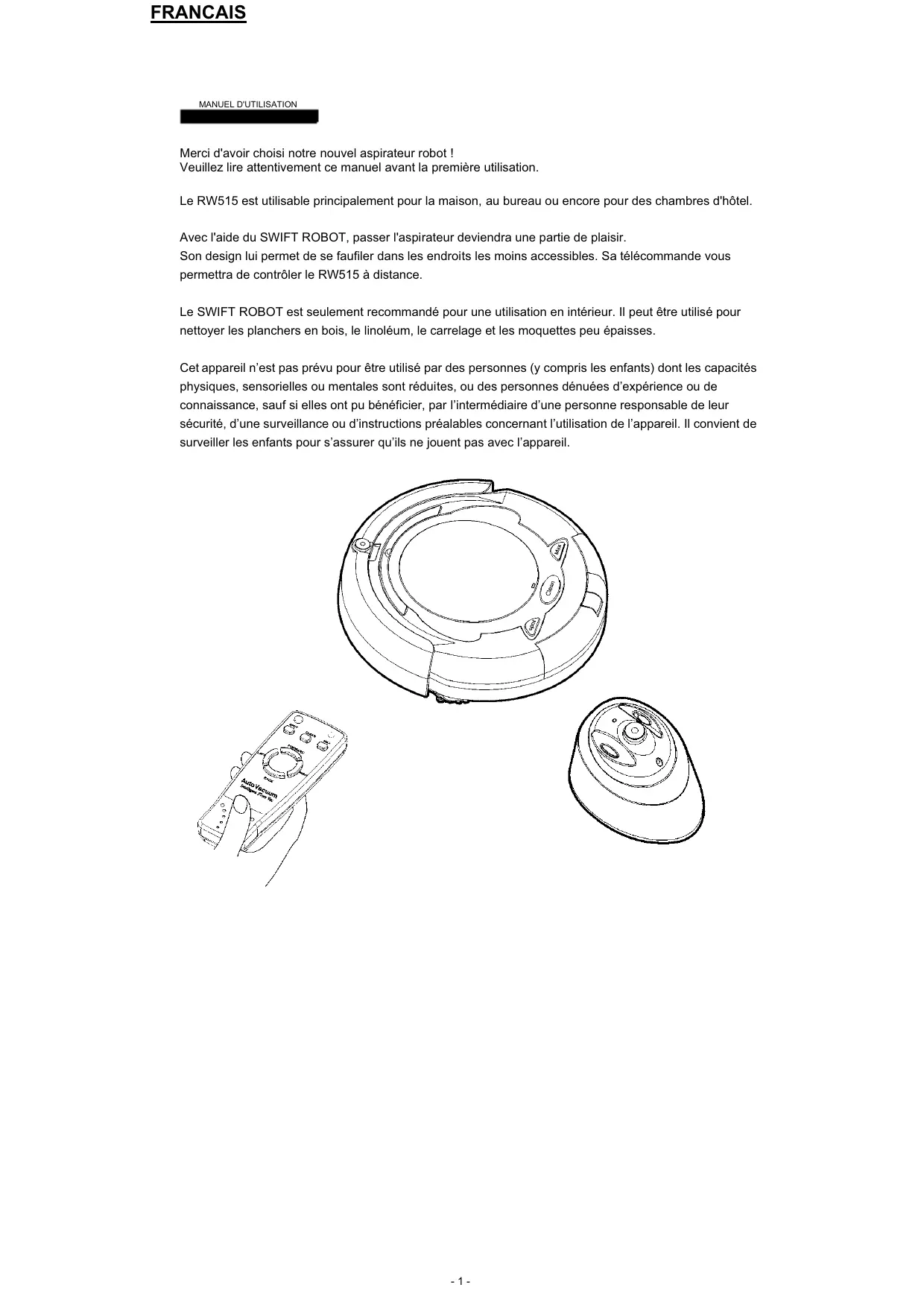 ASPIRATEUR ROBOT ROBOTER-STAUBSAUGER STOFZUIGER ROBOT ASPIRADOR ROBOT ASPIRAPOLVERE ROBOT SWIFT ROBOT WR515 FRANCAIS WR515 MANUEL D'UTILISATION Merci d'avoir choisi notre nouvel aspirateur robot ! Veuillez lire attentivement ce manuel avant la première utilisation. Le RW515 est utilisable principalement pour la maison, au bureau ou encore pour des chambres d'hôtel. Avec l'aide du SWIFT ROBOT, passer l'aspirateur deviendra une partie de plaisir. Son design lui permet de se faufiler dans les endroits les moins accessibles. Sa télécommande vous permettra de contrôler le RW515 à distance. Le SWIFT ROBOT est seulement recommandé pour une utilisation en intérieur. Il peut être utilisé pour nettoyer les planchers en bois, le linoléum, le carrelage et les moquettes peu épaisses. Cet appareil n’est pas prévu pour être utilisé par des personnes (y compris les enfants) dont les capacités physiques, sensorielles ou mentales sont réduites, ou des personnes dénuées d’expérience ou de connaissance, sauf si elles ont pu bénéficier, par l’intermédiaire d’une personne responsable de leur sécurité, d’une surveillance ou d’instructions préalables concernant l’utilisation de l’appareil. Il convient de surveiller les enfants pour s’assurer qu’ils ne jouent pas avec l’appareil.