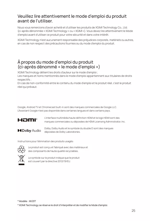 (ci-après dénommé « le mode d'emploi ») XGIMI Technology détient les droits d'auteur sur le mode d'emploi ; Les marques et noms mentionnés dans le mode d'emploi appartiennent aux titulaires de droits respectifs ; En cas de non-conformité entre le contenu du mode d'emploi et le produit réel, c'est le produit réel qui prévaut.