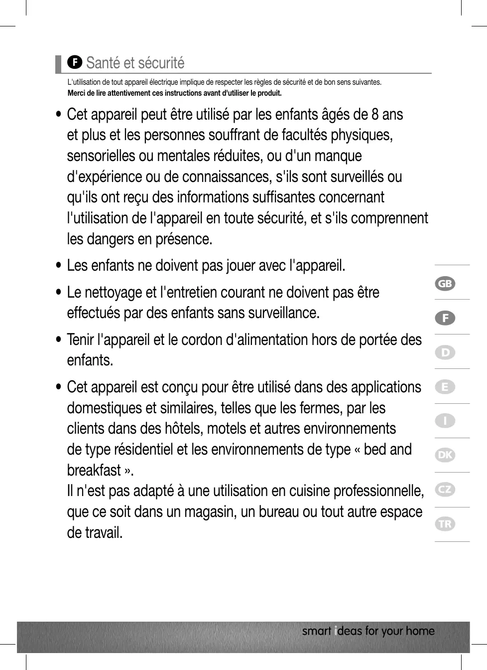 d enfants. • Cet appareil est conçu pour être utilisé dans des applications domestiques et similaires, telles que les fermes, par les clients dans des hôtels, motels et autres environnements de type résidentiel et les environnements de type « bed and breakfast ». Il n'est pas adapté à une utilisation en cuisine professionnelle, que ce soit dans un magasin, un bureau ou tout autre espace de travail.