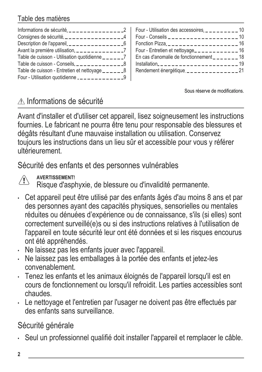 FCV65091XA Table des matières Informations de sécurité Consignes de sécurité Description de l'appareil Avant la première utilisation Table de cuisson - Utilisation quotidienne Table de cuisson - Conseils Table de cuisson - Entretien et nettoyage Four - Utilisation quotidienne