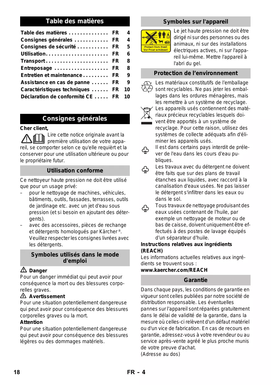 FR 10 FR 10 Consignes générales Cher client, Lire cette notice originale avant la première utilisation de votre appareil, se comporter selon ce qu'elle requièrt et la conserver pour une utilisation ultérieure ou pour le propriétaire futur. Protection de l’environnement Les matériaux constitutifs de l’emballage sont recyclables. Ne pas jeter les emballages dans les ordures ménagères, mais les remettre à un système de recyclage. Les appareils usés contiennent des matériaux précieux recyclables lesquels doivent être apportés à un système de recyclage. Pour cette raison, utilisez des systèmes de collecte adéquats afin d'éliminer les appareils usés. Il est dans certains pays interdit de prélever de l'eau dans les cours d'eau publiques. Les travaux avec du détergent ne doivent être faits que sur des plans de travail étanches aux liquides, avec raccord à la canalisation d'eaux usées. Ne pas laisser le détergent s'infiltrer dans les eaux ou dans le sol. Tous travaux de nettoyage produisant des eaux usées contenant de l’huile, par exemple un nettoyage de moteur ou de bas de caisse, doivent uniquement être effectués à des postes de lavage équipés d’un séparateur d’huile. Instructions relatives aux ingrédients (REACH) Les informations actuelles relatives aux ingrédients se trouvent sous : www.kaercher.com/REACH