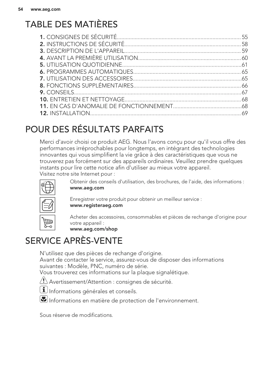 Merci d'avoir choisi ce produit AEG. Nous l'avons conçu pour qu'il vous offre des performances irréprochables pour longtemps, en intégrant des technologies innovantes qui vous simplifient la vie grâce à des caractéristiques que vous ne trouverez pas forcément sur des appareils ordinaires. Veuillez prendre quelques instants pour lire cette notice afin d'utiliser au mieux votre appareil. Visitez notre site Internet pour : Obtenir des conseils d'utilisation, des brochures, de l'aide, des informations : www.aeg.com Enregistrer votre produit pour obtenir un meilleur service : www.registeraeg.com Acheter des accessoires, consommables et pièces de rechange d'origine pour votre appareil : www.aeg.com/shop