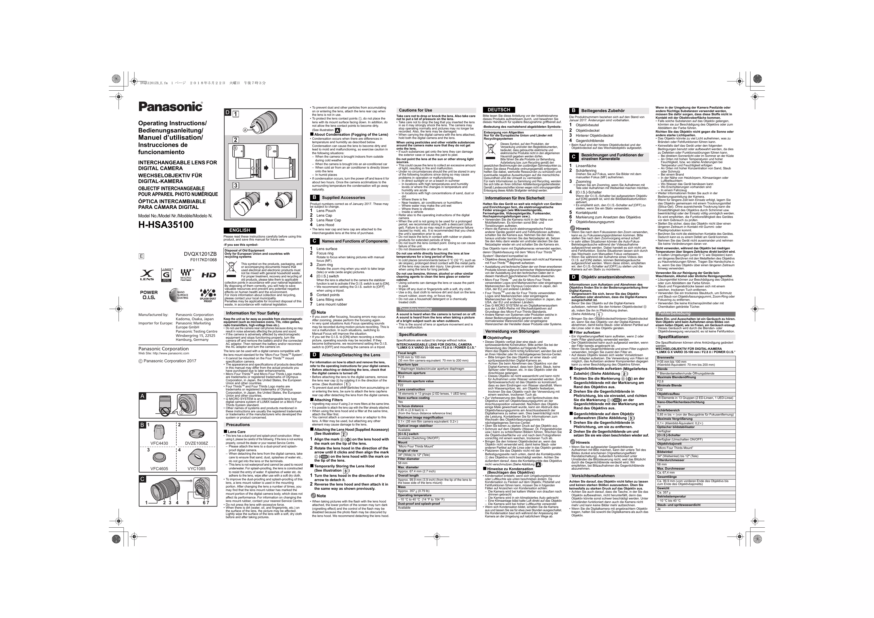 H-HSA35100E - Objectif d'appareil photo numérique PANASONIC - Notice d'utilisation et mode d'emploi gratuit
