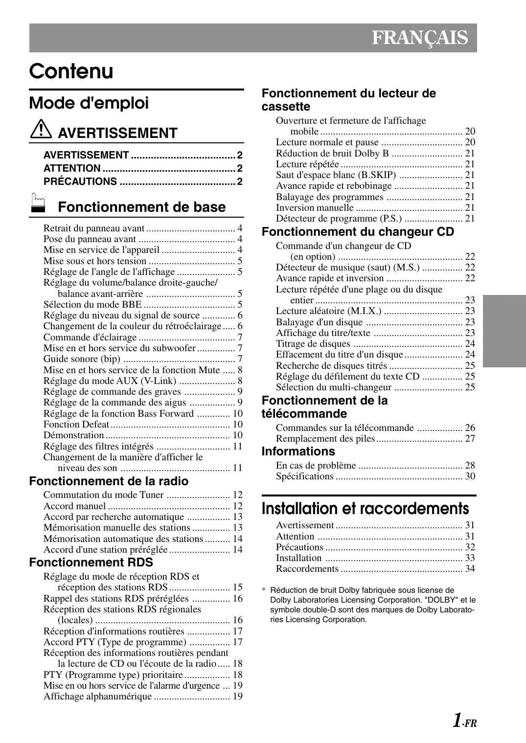 - Réduction de bruit Dolby fabriquée sous license de Dolby Laboratories Licensing Corporation. "DOLBY" et le symbole double-D sont des marques de Dolby Laboratories Licensing Corporation. 1-FR AVERTISSEMENT AVERTISSEMENT Ce symbole désigne des instructions importantes. Le non-respect de ces instructions peut entraîner de graves blessures, voire la mort. ATTENTION Ce symbole désigne des instructions importantes. Le non-respect de ces instructions peut entraîner des blessures ou des dommages matériels.
