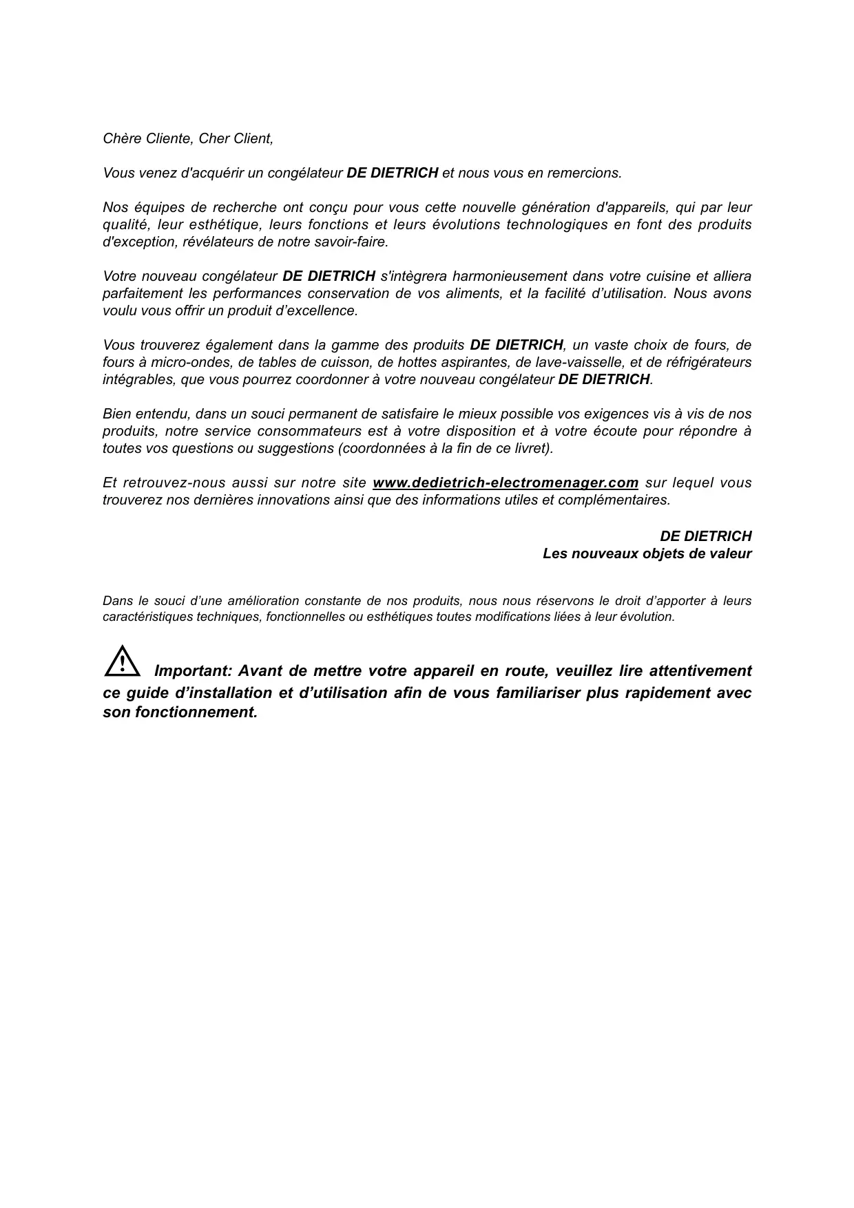 Congélateur Freezer Diepvrieskast Gefrierschrank Congelador Congelador 2222722-34 Chère Cliente, Cher Client, Vous venez d'acquérir un congélateur DE DIETRICH et nous vous en remercions. Nos équipes de recherche ont conçu pour vous cette nouvelle génération d'appareils, qui par leur qualité, leur esthétique, leurs fonctions et leurs évolutions technologiques en font des produits d'exception, révélateurs de notre savoir-faire. Votre nouveau congélateur DE DIETRICH s'intègrera harmonieusement dans votre cuisine et alliera parfaitement les performances conservation de vos aliments, et la facilité d’utilisation. Nous avons voulu vous offrir un produit d’excellence. Vous trouverez également dans la gamme des produits DE DIETRICH, un vaste choix de fours, de fours à micro-ondes, de tables de cuisson, de hottes aspirantes, de lave-vaisselle, et de réfrigérateurs intégrables, que vous pourrez coordonner à votre nouveau congélateur DE DIETRICH. Bien entendu, dans un souci permanent de satisfaire le mieux possible vos exigences vis à vis de nos produits, notre service consommateurs est à votre disposition et à votre écoute pour répondre à toutes vos questions ou suggestions (coordonnées à la fin de ce livret). Et retrouvez-nous aussi sur notre site www.dedietrich-electromenager.com sur lequel vous trouverez nos dernières innovations ainsi que des informations utiles et complémentaires. DE DIETRICH Les nouveaux objets de valeur Dans le souci d’une amélioration constante de nos produits, nous nous réservons le droit d’apporter à leurs caractéristiques techniques, fonctionnelles ou esthétiques toutes modifications liées à leur évolution. Important: Avant de mettre votre appareil en route, veuillez lire attentivement ce guide d’installation et d’utilisation afin de vous familiariser plus rapidement avec son fonctionnement. Comment lire votre notice d’emploi Les symboles ci-dessous vous guideront au long de la lecture de votre notice: Instructions liées à la sécurité lors de l’utilisation de l’appareil. Conseils pour une utilisation correcte de l’appareil afin d’obtenir les meilleures performances. Informations liées à la protection de l’environnement. Avertissements importants Ce sont des avertissements de sécurité. Nous vous prions donc de les lire attentivement avant d’installer et d’utiliser votre appareil. Nous recommandons de conserver cette notice afin de pouvoir la consulter au besoin et de la remettre, le cas échéant, au nouveau propriétaire de l’appareil. Usage domestique
