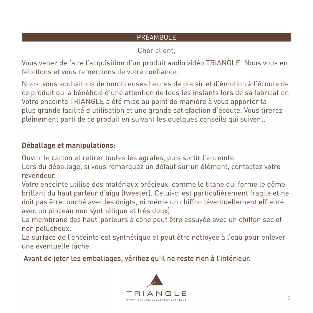 Vou venez de faire l'acquisition d'un produit audio video TRIANGLE. Nous vous en félicitons et vous remercions de votre confiance.