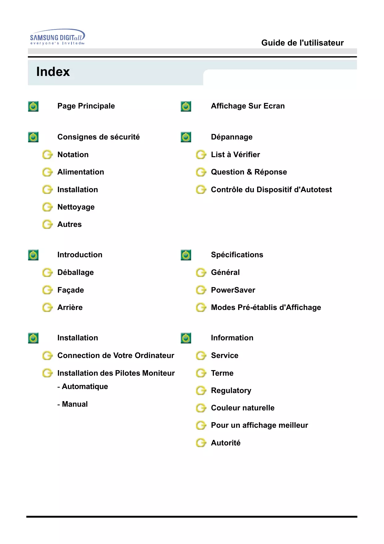 Si vous n'êtes pas satisfait de la qualité de l'image, vous pouvez améliorer l'affichage en exécutant la “fonction de réglage automatique“ sur l'écran qui s'affiche après avoir appuyé sur le bouton de fermeture de la fenêtre. Si le bruit subsiste après le réglage automatique, utilisez la fonction de réglage de la clarification (FINE/COARSE). Guide de l'utilisateur Information Autorité Les informations contenues dans ce document peuvent être soumises à des modifications sans préavis. © 2002 Samsung Electronics Co., Ltd. Tous droits résérvés. Toute reproduction par quelque moyen que ce soit , est strictement interdits sans l'autorisation écrite de Samsung Electronics Co., Ltd. Samsung Electronics Co., Ltd.n'est pas responsable pour des dommages s ou accidents pour une installation, pour une demonstration ou pour l'usage de ce matériel. Logo de Samsung sont des marques commerciales déposées de Samsung Electronics Co., Ltd.; "Microsoft", "Windows", "Windows NT" sont des marques commerciales déposées de Microsoft Corporation. "VESA", "DPMS" et "DDC" sont des marques commerciales déposées de Video Electronics Standard Association; Le nom et le logo d' "ENERGY STAR" sont des marques commerciales déposées de U.S. Environmental Protection Agency (EPA). En sa qualité de partenariat avec ENERGY STAR, Samsung Electronics Co., Ltd.affirme que ce produit répond aux directives de ENERGY STAR concernant l'économie de l'énergie. Tous les autres noms de produits mentionnés ci-dessous peuvent être les marques ou les marques déposées de leurs propriétaire respectifs.