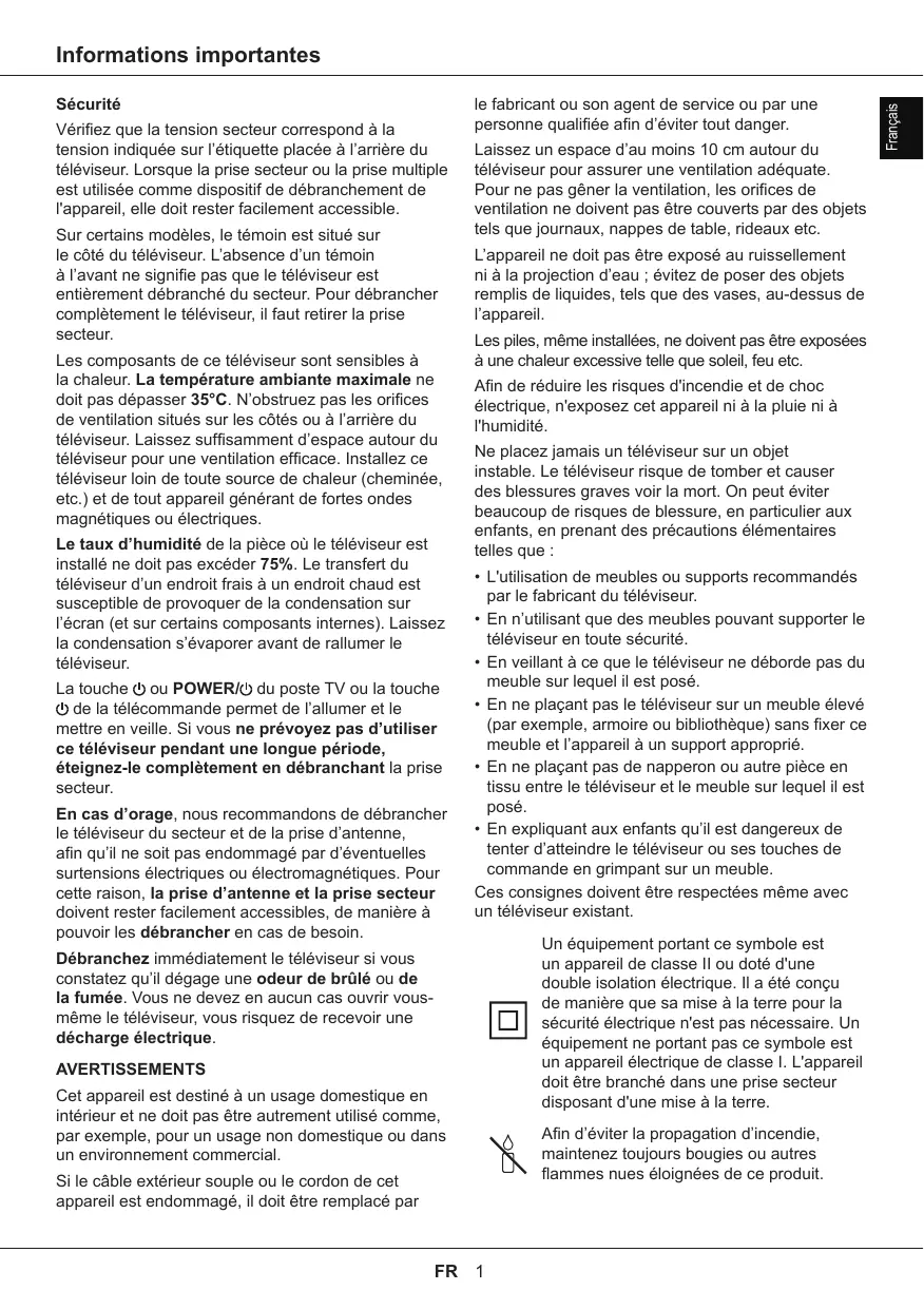 - En expliquant aux enfants qu’il est dangereux de tenter d’atteindre le téléviseur ou ses touches de commande en grimpant sur un meuble. Ces consignes doivent être respectées même avec un téléviseur existant. Débranchez immédiatement le téléviseur si vous constatez qu’il dégage une odeur de brûlé ou de la fumée. Vous ne devez en aucun cas ouvrir vousmême le téléviseur, vous risquez de recevoir une décharge électrique. AVERTISSEMENTS Cet appareil est destiné à un usage domestique en intérieur et ne doit pas être autrement utilisé comme, par exemple, pour un usage non domestique ou dans un environnement commercial. Si le câble extérieur souple ou le cordon de cet appareil est endommagé, il doit être remplacé par FR 1 Un équipement portant ce symbole est un appareil de classe II ou doté d'une double isolation électrique. Il a été conçu de manière que sa mise à la terre pour la sécurité électrique n'est pas nécessaire. Un équipement ne portant pas ce symbole est un appareil électrique de classe I. L'appareil doit être branché dans une prise secteur disposant d'une mise à la terre. Afin d’éviter la propagation d’incendie, maintenez toujours bougies ou autres flammes nues éloignées de ce produit. Français Informations importantes Informations importantes Français Ce symbole indique qu'un haut voltage est présent à l'intérieur. Il est dangereux d'établir tout type de contact avec une partie interne de ce produit.