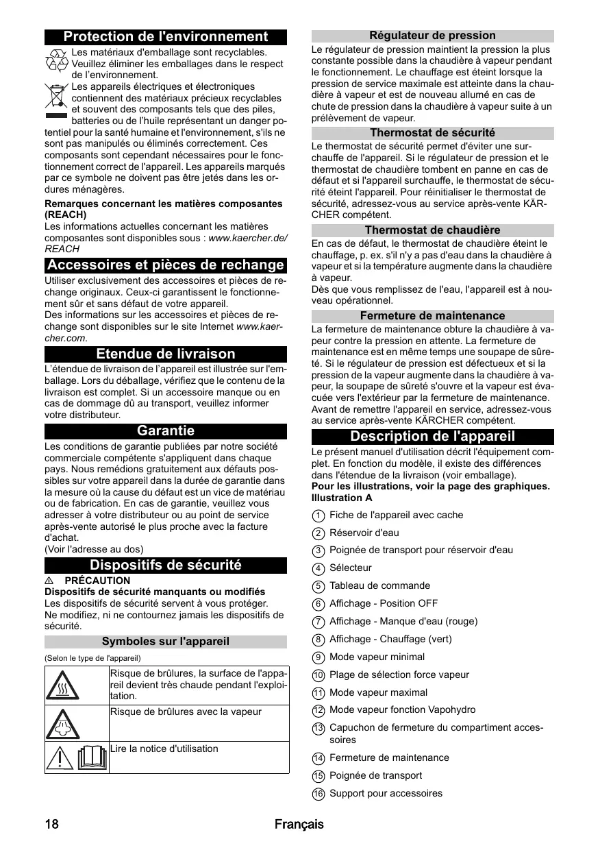 Protection de l'environnement Régulateur de pression Les matériaux d'emballage sont recyclables. Veuillez éliminer les emballages dans le respect de l’environnement. Les appareils électriques et électroniques contiennent des matériaux précieux recyclables et souvent des composants tels que des piles, batteries ou de l’huile représentant un danger potentiel pour la santé humaine et l'environnement, s'ils ne sont pas manipulés ou éliminés correctement. Ces composants sont cependant nécessaires pour le fonctionnement correct de l'appareil. Les appareils marqués par ce symbole ne doivent pas être jetés dans les ordures ménagères. Remarques concernant les matières composantes (REACH) Les informations actuelles concernant les matières composantes sont disponibles sous : www.kaercher.de/ REACH Accessoires et pièces de rechange Utiliser exclusivement des accessoires et pièces de rechange originaux. Ceux-ci garantissent le fonctionnement sûr et sans défaut de votre appareil. Des informations sur les accessoires et pièces de rechange sont disponibles sur le site Internet www.kaercher.com. Etendue de livraison L’étendue de livraison de l’appareil est illustrée sur l'emballage. Lors du déballage, vérifiez que le contenu de la livraison est complet. Si un accessoire manque ou en cas de dommage dû au transport, veuillez informer votre distributeur. Garantie Les conditions de garantie publiées par notre société commerciale compétente s'appliquent dans chaque pays. Nous remédions gratuitement aux défauts possibles sur votre appareil dans la durée de garantie dans la mesure où la cause du défaut est un vice de matériau ou de fabrication. En cas de garantie, veuillez vous adresser à votre distributeur ou au point de service après-vente autorisé le plus proche avec la facture d'achat. (Voir l'adresse au dos) Dispositifs de sécurité 몇 PRÉCAUTION Dispositifs de sécurité manquants ou modifiés Les dispositifs de sécurité servent à vous protéger. Ne modifiez, ni ne contournez jamais les dispositifs de sécurité. Symboles sur l'appareil (Selon le type de l'appareil) Le régulateur de pression maintient la pression la plus constante possible dans la chaudière à vapeur pendant le fonctionnement. Le chauffage est éteint lorsque la pression de service maximale est atteinte dans la chaudière à vapeur et est de nouveau allumé en cas de chute de pression dans la chaudière à vapeur suite à un prélèvement de vapeur. Thermostat de sécurité Le thermostat de sécurité permet d'éviter une surchauffe de l'appareil. Si le régulateur de pression et le thermostat de chaudière tombent en panne en cas de défaut et si l'appareil surchauffe, le thermostat de sécurité éteint l'appareil. Pour réinitialiser le thermostat de sécurité, adressez-vous au service après-vente KÄRCHER compétent. Thermostat de chaudière En cas de défaut, le thermostat de chaudière éteint le chauffage, p. ex. s'il n'y a pas d'eau dans la chaudière à vapeur et si la température augmente dans la chaudière à vapeur. Dès que vous remplissez de l'eau, l'appareil est à nouveau opérationnel. Fermeture de maintenance La fermeture de maintenance obture la chaudière à vapeur contre la pression en attente. La fermeture de maintenance est en même temps une soupape de sûreté. Si le régulateur de pression est défectueux et si la pression de la vapeur augmente dans la chaudière à vapeur, la soupape de sûreté s'ouvre et la vapeur est évacuée vers l'extérieur par la fermeture de maintenance. Avant de remettre l'appareil en service, adressez-vous au service après-vente KÄRCHER compétent. Description de l'appareil Le présent manuel d'utilisation décrit l'équipement complet. En fonction du modèle, il existe des différences dans l'étendue de la livraison (voir emballage). Pour les illustrations, voir la page des graphiques. Illustration A
