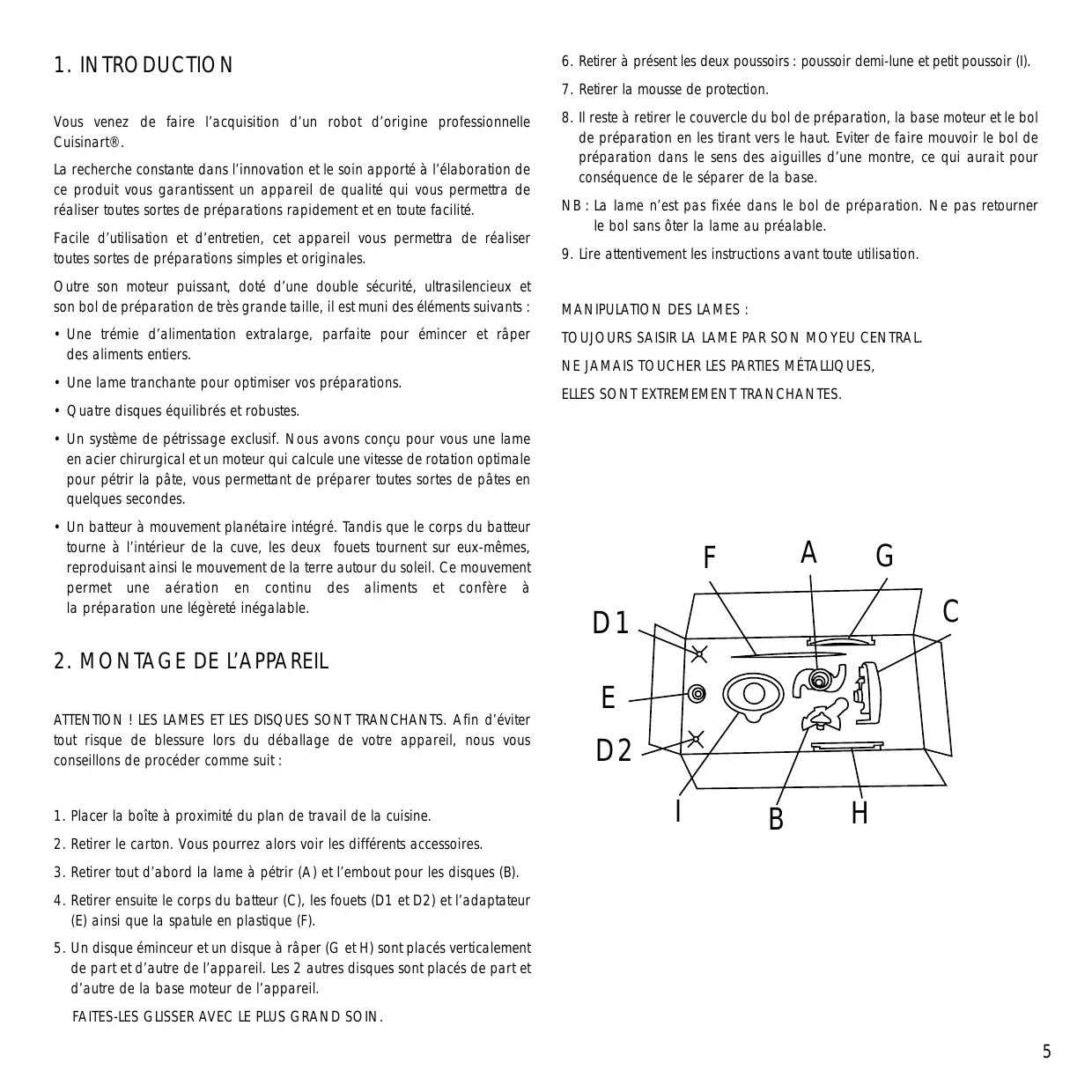 être manipulé avec précaution. Suivre les conseils ci-dessous afin d’éviter tout risque de blessure. • Manier les lames et les disques avec le plus grand soin. Éviter de toucher les parties métalliques tranchantes. • Toujours mettre la lame en place avant d’ajouter les ingrédients. • Ne jamais placer de lame ou de disque sur l’axe du moteur avant d’avoir verrouillé le bol. • Avant d’allumer l’appareil, s’assurer que la lame ou le disque est enfoncé(e) au maximum sur l’axe du moteur, et que le couvercle est correctement placé. Ne pas forcer ou bloquer le mécanisme du couvercle. • Utiliser la spatule uniquement lorsque le moteur est à l’arrêt. Éviter tout contact avec les pièces en mouvement. • Toujours mettre la lame en place avant d’ajouter les ingrédients. • Pour râper ou émincer des aliments, toujours utiliser le poussoir. Ne jamais pousser avec les doigts ni aucun autre ustensile. • Toujours attendre que la lame ou le disque ait cessé de tourner avant de retirer les poussoirs ou le couvercle. • Débrancher l’appareil avant de le nettoyer, de mettre en place ou de retirer les accessoires. • Retirer le bol de la base avant d’ôter la lame. • Veiller à empêcher la lame de tomber en la maintenant lorsque le bol est vidé. • Utiliser exclusivement cet appareil avec les accessoires fournis par Cuisinart®. • Ne pas immerger la base de l’appareil dans l’eau ou tout autre liquide. • Débrancher l’appareil après utilisation, avant de l’assembler ou de le démonter, avant de retirer les aliments et avant de le nettoyer. Ne jamais laisser l’appareil branché sans surveillance. Pour débrancher, tirer sur la fiche et jamais sur le cordon. • Ne pas laisser le cordon dépasser du bord du plan de travail, et ne pas le mettre en contact avec des surfaces chaudes. • Ne pas laisser la lame sur l’axe du moteur lorsque l’appareil n’est pas utilisé. Ranger les lames et les disques hors de portée des enfants. • Se montrer particulièrement vigilant si l’appareil est utilisé à proximité d’enfants. Le ranger hors de portée des enfants. Ne pas laisser les enfants utiliser le robot d’origine professionnelle. • Ne pas utiliser l’appareil s’il est tombé ou s’il présente des traces apparentes de dommage. • Cesser immédiatement d’utiliser l’appareil si le cordon est endommagé et faire remplacer celui-ci par un professionnel. • Aucune réparation ne peut être effectuée par l’utilisateur. • Cet appareil satisfait aux exigences essentielles des directives 89/336/CEE (compatibilité électromagnétique) et 73/23/CEE (sécurité des appareils électro-domestiques), amendées par la directive 93/68/CEE (marquage CE). • Utiliser cet appareil exclusivement pour cuisiner, en suivant les instructions de ce manuel. • Ne pas utiliser à l’extérieur. • A usage domestique uniquement.