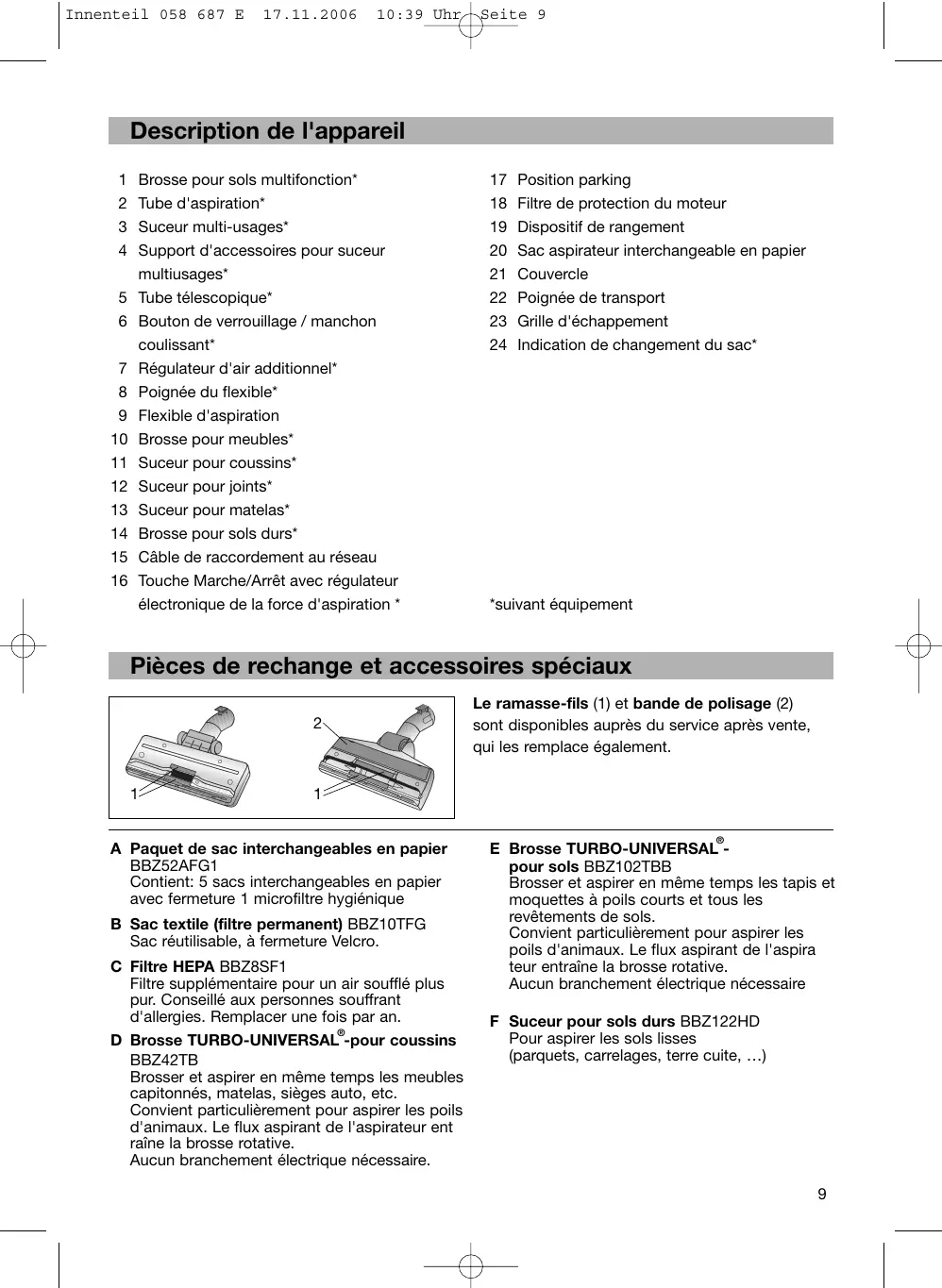 Suceur pour joints* Suceur pour matelas* Brosse pour sols durs* Câble de raccordement au réseau Touche Marche/Arrêt avec régulateur électronique de la force d'aspiration *
