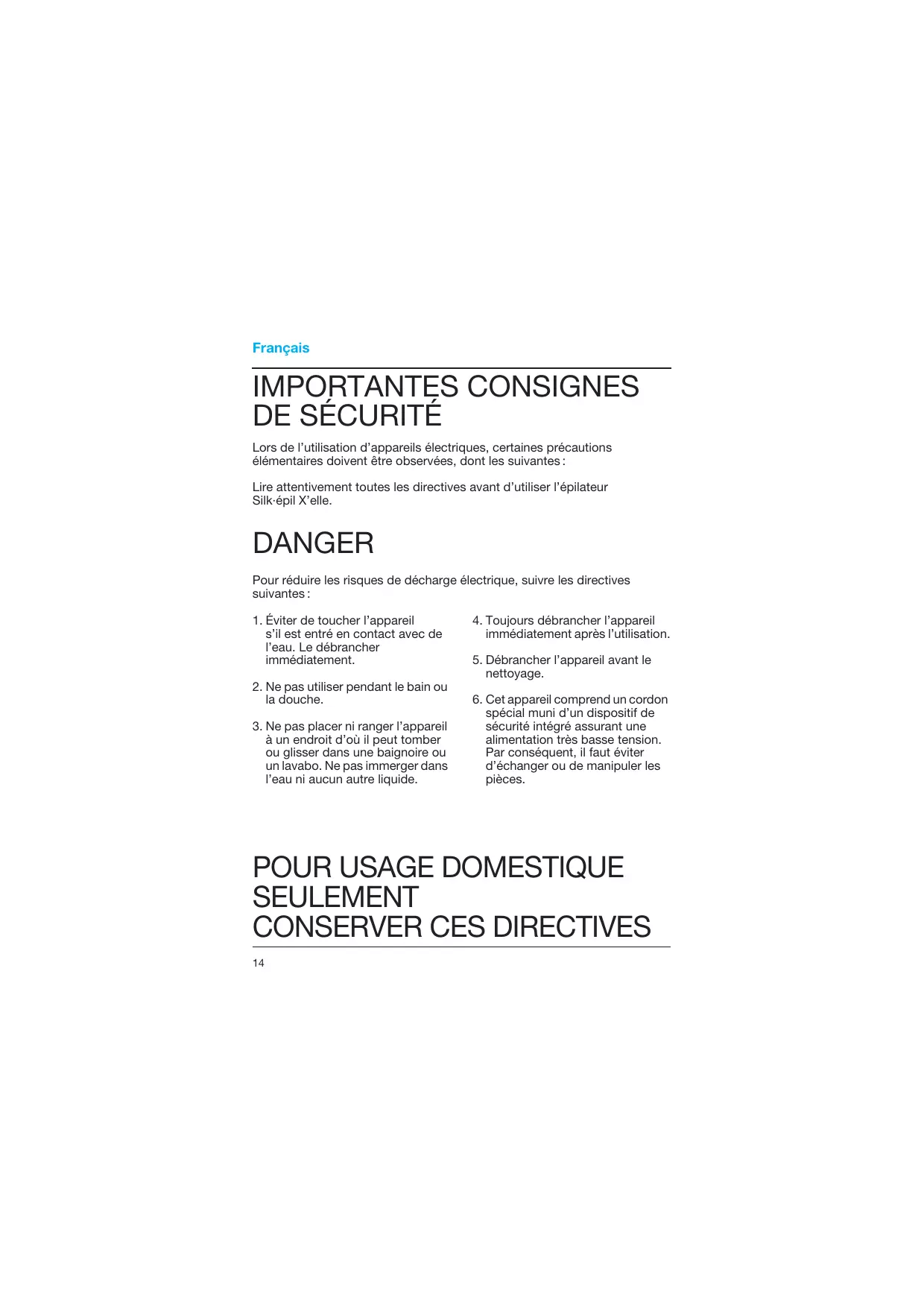 Lors de l’utilisation d’appareils électriques, certaines précautions élémentaires doivent être observées, dont les suivantes : Lire attentivement toutes les directives avant d’utiliser l’épilateur Silk·épil X’elle. DANGER Pour réduire les risques de décharge électrique, suivre les directives suivantes :