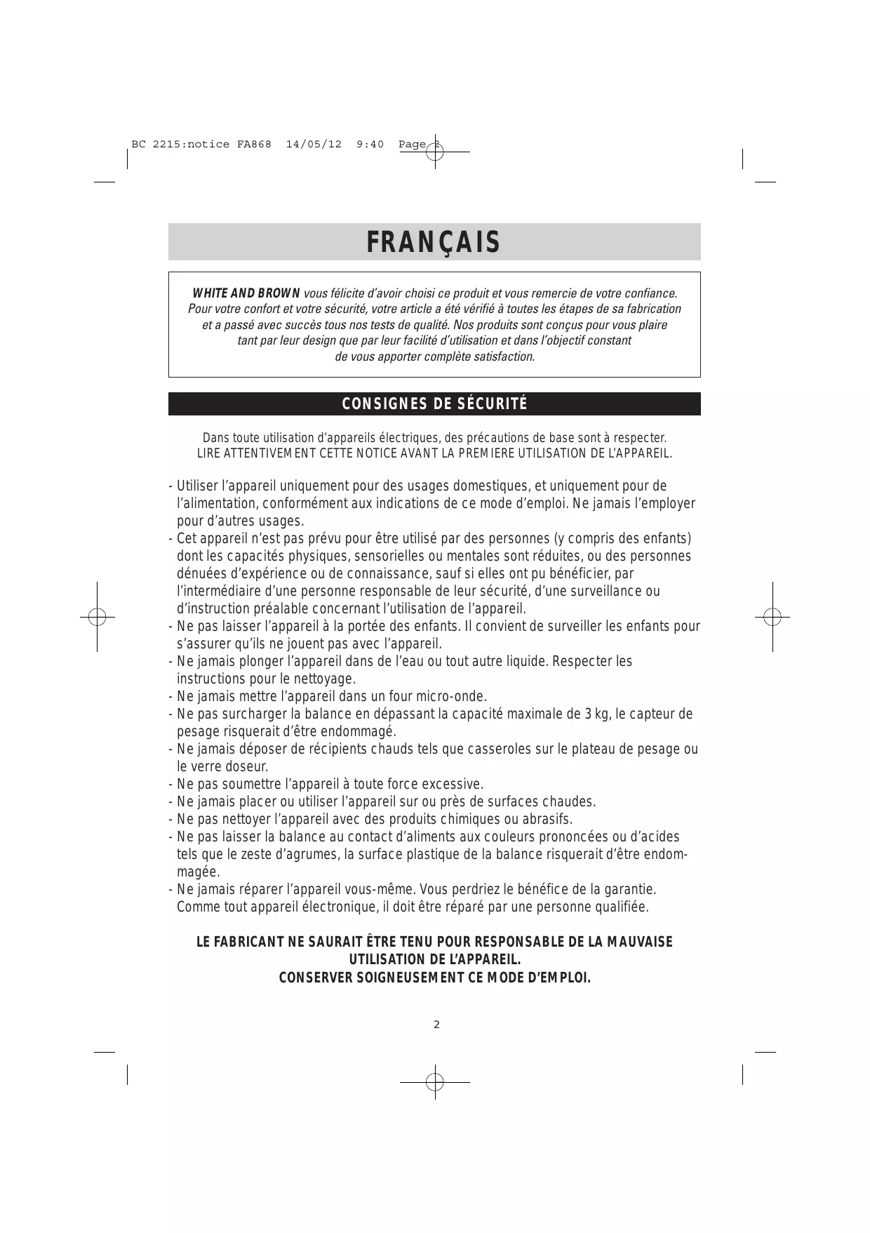 BC 2215 BC 2215:notice FA868 14/05/12 9:40 Page 2 FRANÇAIS WHITE AND BROWN vous félicite d’avoir choisi ce produit et vous remercie de votre confiance. Pour votre confort et votre sécurité, votre article a été vérifié à toutes les étapes de sa fabrication et a passé avec succès tous nos tests de qualité. Nos produits sont conçus pour vous plaire tant par leur design que par leur facilité d’utilisation et dans l’objectif constant de vous apporter complète satisfaction.