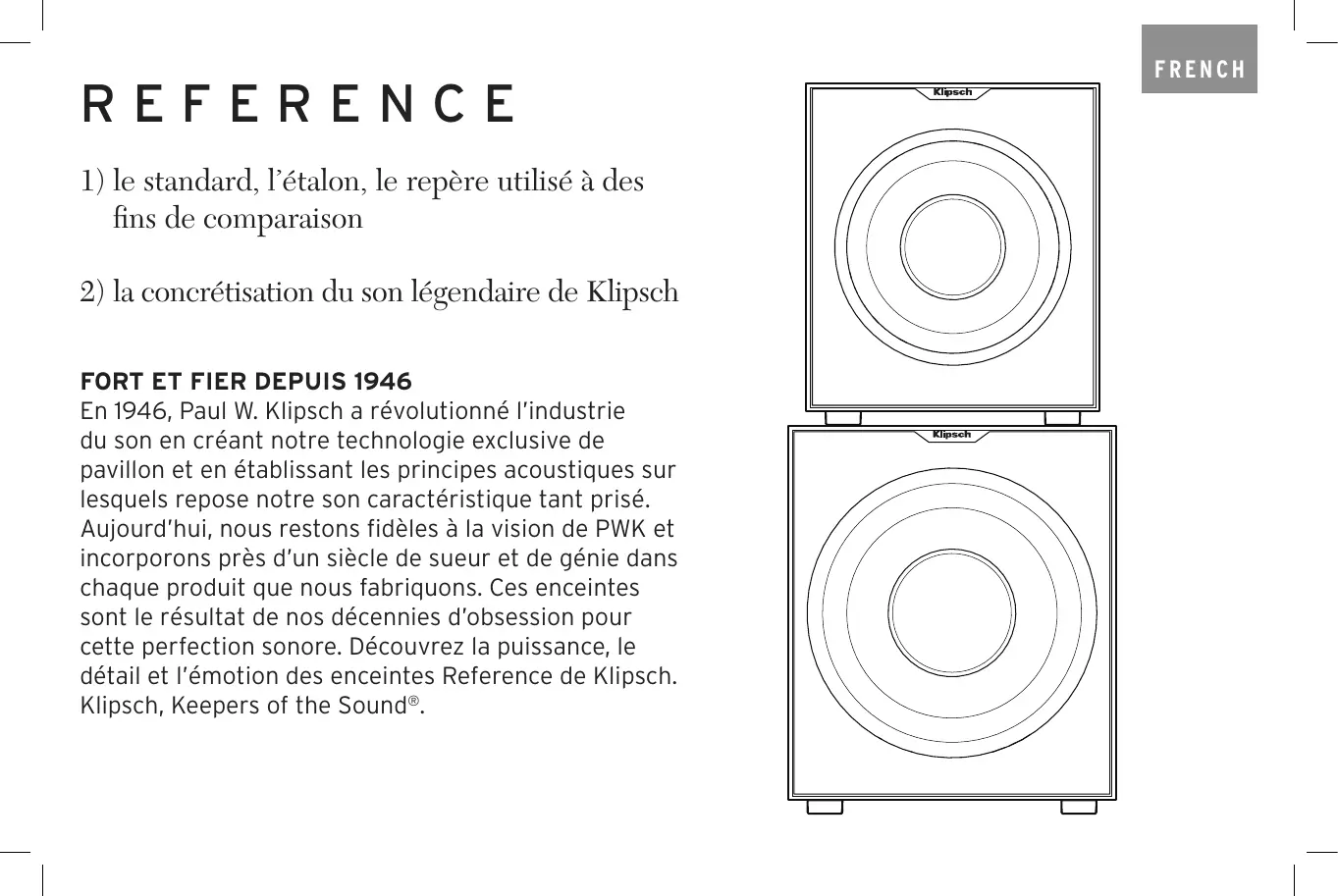 USER MANUAL SUBWOOFERS REFERENCE 1) le standard, l’étalon, le repère utilisé à des fins de comparaison 2) la concrétisation du son légendaire de Klipsch FORT ET FIER DEPUIS 1946 En 1946, Paul W. Klipsch a révolutionné l’industrie du son en créant notre technologie exclusive de pavillon et en établissant les principes acoustiques sur lesquels repose notre son caractéristique tant prisé. Aujourd’hui, nous restons fidèles à la vision de PWK et incorporons près d’un siècle de sueur et de génie dans chaque produit que nous fabriquons. Ces enceintes sont le résultat de nos décennies d’obsession pour cette perfection sonore. Découvrez la puissance, le détail et l’émotion des enceintes Reference de Klipsch. Klipsch, Keepers of the Sound®.