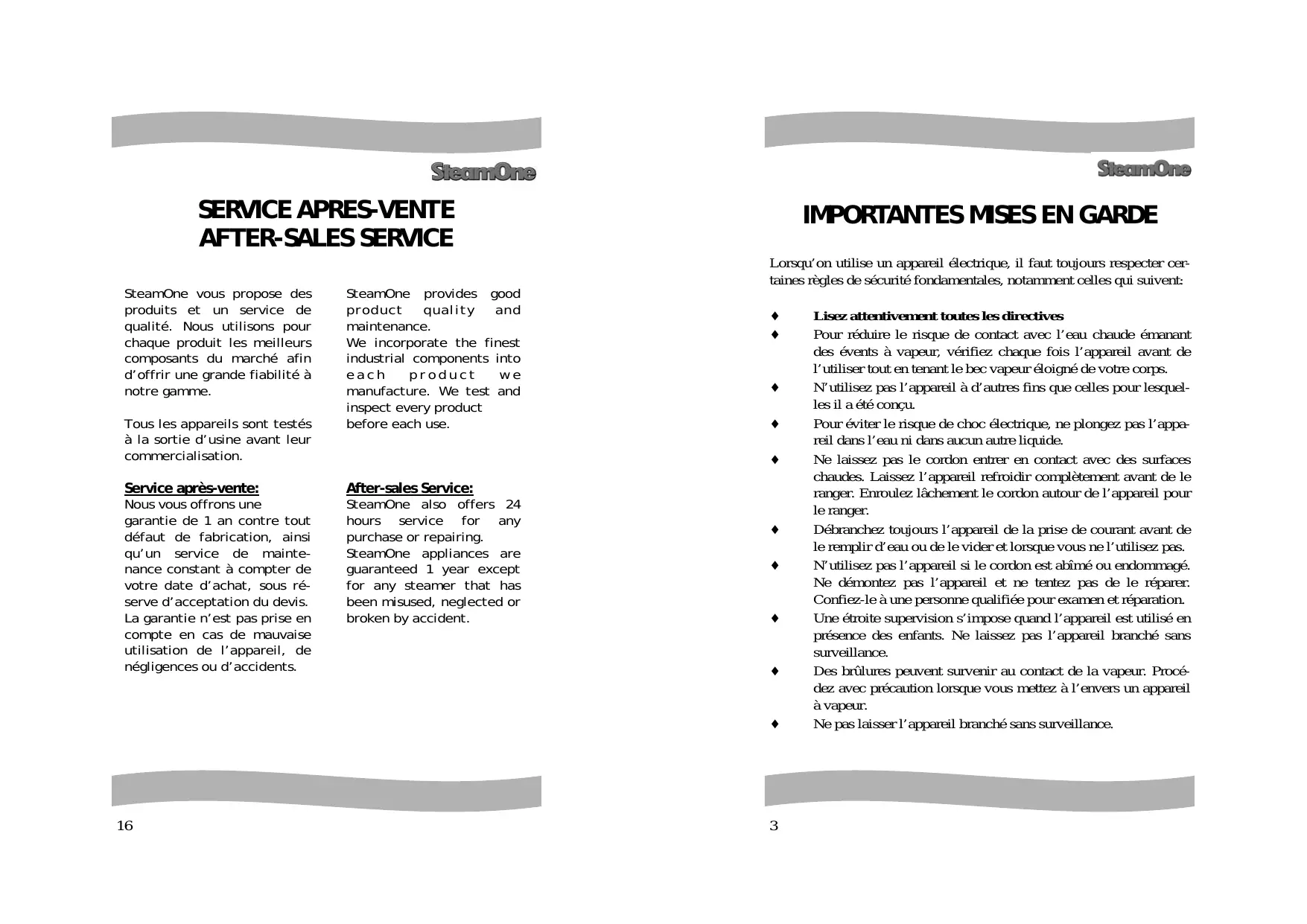 Lisez attentivement toutes les directives Pour réduire le risque de contact avec l’eau chaude émanant des évents à vapeur, vérifiez chaque fois l’appareil avant de l’utiliser tout en tenant le bec vapeur éloigné de votre corps. N’utilisez pas l’appareil à d’autres fins que celles pour lesquelles il a été conçu. Pour éviter le risque de choc électrique, ne plongez pas l’appareil dans l’eau ni dans aucun autre liquide. Ne laissez pas le cordon entrer en contact avec des surfaces chaudes. Laissez l’appareil refroidir complètement avant de le ranger. Enroulez lâchement le cordon autour de l’appareil pour le ranger. Débranchez toujours l’appareil de la prise de courant avant de le remplir d’eau ou de le vider et lorsque vous ne l’utilisez pas. N’utilisez pas l’appareil si le cordon est abîmé ou endommagé. Ne démontez pas l’appareil et ne tentez pas de le réparer. Confiez-le à une personne qualifiée pour examen et réparation. Une étroite supervision s’impose quand l’appareil est utilisé en présence des enfants. Ne laissez pas l’appareil branché sans surveillance. Des brûlures peuvent survenir au contact de la vapeur. Procédez avec précaution lorsque vous mettez à l’envers un appareil à vapeur. Ne pas laisser l’appareil branché sans surveillance. SERVICE APRES-VENTE AFTER-SALES SERVICE