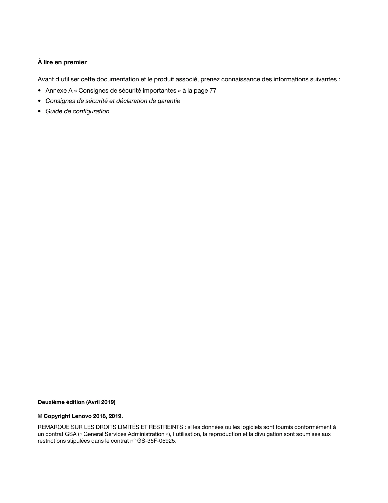 Deuxième édition (Avril 2019) © Copyright Lenovo 2018, 2019. REMARQUE SUR LES DROITS LIMITÉS ET RESTREINTS : si les données ou les logiciels sont fournis conformément à un contrat GSA (« General Services Administration »), l'utilisation, la reproduction et la divulgation sont soumises aux restrictions stipulées dans le contrat n° GS-35F-05925.