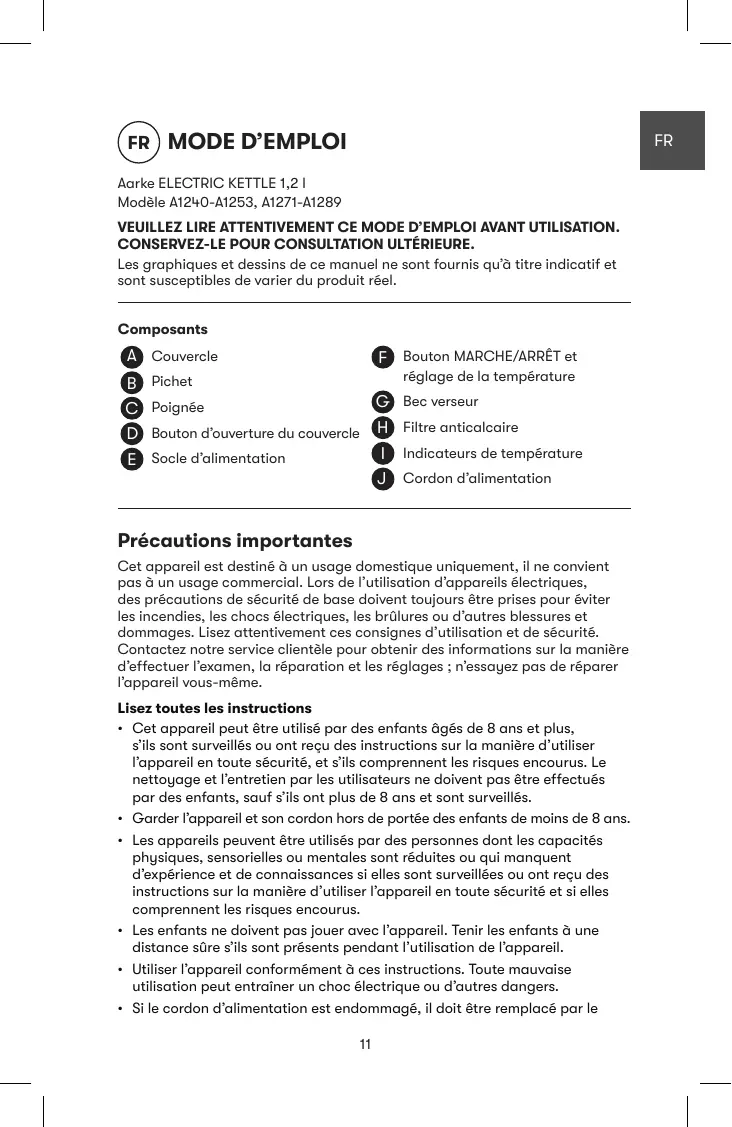 - les cuisines du personnel dans les magasins, les bureaux et autres environnements de travail ; - les fermes ; - les clients dans les hôtels, les motels et autres environnements de type résidentiel ; - les environnements de type chambre d’hôtes. Ne pas faire fonctionner l’appareil s’il est endommagé, après un dysfonctionnement ou s’il a été endommagé de quelque manière que ce soit. Éviter tout déversement de liquide sur le connecteur. La surface de l’élément chauffant est sujette à une chaleur résiduelle après utilisation. Cet appareil n’est pas conçu pour chauffer d’autres liquides que de l’eau. L’appareil ne doit être utilisé qu’avec de l’eau claire, filtrée et froide. Ne pas utiliser d’eau chaude. Ne pas utiliser l’appareil si la poignée est desserrée ou endommagée. Cet appareil doit être branché sur une prise de courant reliée à la terre. Avant de brancher l’appareil au réseau électrique, s’assurer que la tension indiquée sur la plaque signalétique, située sous l’appareil, correspond à celle de votre habitation. Si ce n’est pas le cas, contacter le revendeur et ne pas utiliser l’appareil. L’appareil s’éteint automatiquement lorsque l’eau a atteint la température programmée. Pour arrêter le processus de chauffage avant que l’appareil ne s’éteigne automatiquement, appuyer sur le bouton situé sur le socle. L’appareil est conçu pour couper l’alimentation électrique de l’élément dans des conditions de fonctionnement anormales. Si l’appareil est accidentellement mis en marche sans eau, la protection contre l’ébullition est déclenchée. Si l’appareil est à sec, le voyant d’alimentation s’éteint. Laisser refroidir pendant 15 minutes avant de remplir l’appareil d’eau froide. Le dispositif de sécurité se réinitialise automatiquement pendant ce temps. Placer l’appareil sur une surface plane et stable. Toujours remplir l’appareil d’eau avant de le mettre en marche. Ne jamais remplir l’appareil au-delà du niveau d’eau maximal acceptable. Si l’appareil est trop rempli, il peut projeter de l’eau bouillante. Ne pas utiliser cet appareil à l’extérieur ou dans des endroits humides. S’assurer que l’appareil est éteint avant de le retirer de son socle. Ne pas retirer l’appareil du socle d’alimentation pendant le fonctionnement. Ne jamais plonger l’appareil ou le cordon dans l’eau ou dans tout autre liquide. Ne pas laisser de liquide pénétrer dans les parties électriques de cet appareil. Veiller à ce que les enfants ne tirent pas sur le cordon d’alimentation et ne renversent pas l’appareil. 12