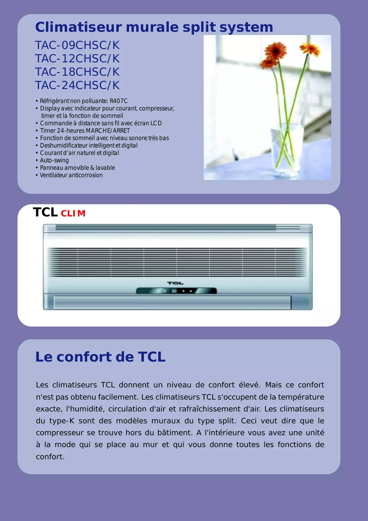 TCL CLIM Le confort de TCL Les climatiseurs TCL donnent un niveau de confort élevé. Mais ce confort n'est pas obtenu facilement. Les climatiseurs TCL s'occupent de la température exacte, l'humidité, circulation d'air et rafraîchissement d'air. Les climatiseurs du type-K sont des modèles muraux du type split. Ceci veut dire que le compresseur se trouve hors du bâtiment. A l'intérieure vous avez une unité à la mode qui se place au mur et qui vous donne toutes les fonctions de confort.