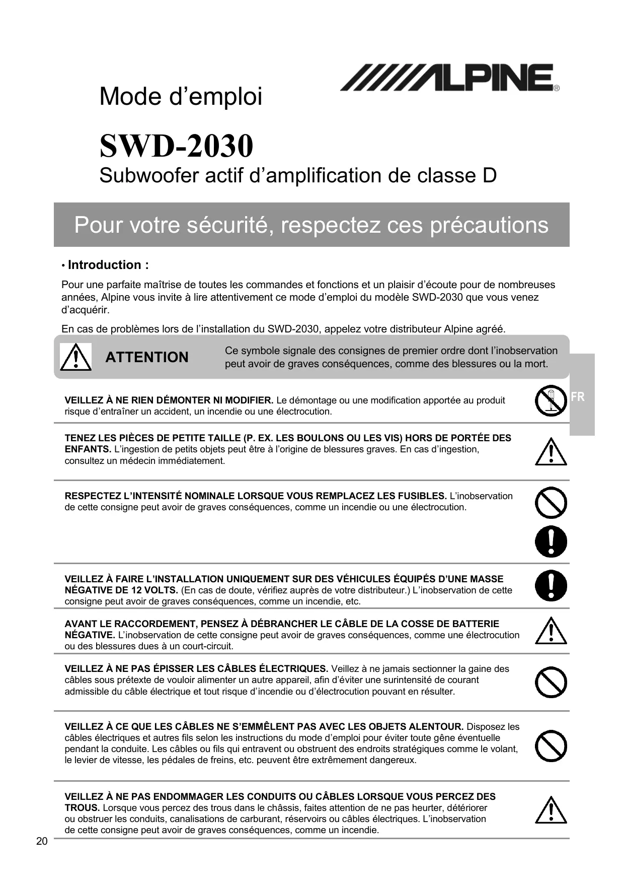 - Introduction : Pour une parfaite maîtrise de toutes les commandes et fonctions et un plaisir d’écoute pour de nombreuses années, Alpine vous invite à lire attentivement ce mode d’emploi du modèle SWD-2030 que vous venez d’acquérir. En cas de problèmes lors de l’installation du SWD-2030, appelez votre distributeur Alpine agréé. ATTENTION Ce symbole signale des consignes de premier ordre dont l’inobservation peut avoir de graves conséquences, comme des blessures ou la mort. VEILLEZ À NE RIEN DÉMONTER NI MODIFIER. Le démontage ou une modification apportée au produit risque d’entraîner un accident, un incendie ou une électrocution. TENEZ LES PIÈCES DE PETITE TAILLE (P. EX. LES BOULONS OU LES VIS) HORS DE PORTÉE DES ENFANTS. L’ingestion de petits objets peut être à l’origine de blessures graves. En cas d’ingestion, consultez un médecin immédiatement. RESPECTEZ L’INTENSITÉ NOMINALE LORSQUE VOUS REMPLACEZ LES FUSIBLES. L’inobservation de cette consigne peut avoir de graves conséquences, comme un incendie ou une électrocution. VEILLEZ À FAIRE L’INSTALLATION UNIQUEMENT SUR DES VÉHICULES ÉQUIPÉS D’UNE MASSE NÉGATIVE DE 12 VOLTS. (En cas de doute, vérifiez auprès de votre distributeur.) L’inobservation de cette consigne peut avoir de graves conséquences, comme un incendie, etc. AVANT LE RACCORDEMENT, PENSEZ À DÉBRANCHER LE CÂBLE DE LA COSSE DE BATTERIE NÉGATIVE. L’inobservation de cette consigne peut avoir de graves conséquences, comme une électrocution ou des blessures dues à un court-circuit. VEILLEZ À NE PAS ÉPISSER LES CÂBLES ÉLECTRIQUES. Veillez à ne jamais sectionner la gaine des câbles sous prétexte de vouloir alimenter un autre appareil, afin d’éviter une surintensité de courant admissible du câble électrique et tout risque d’incendie ou d’électrocution pouvant en résulter. VEILLEZ À CE QUE LES CÂBLES NE S’EMMÊLENT PAS AVEC LES OBJETS ALENTOUR. Disposez les câbles électriques et autres fils selon les instructions du mode d’emploi pour éviter toute gêne éventuelle pendant la conduite. Les câbles ou fils qui entravent ou obstruent des endroits stratégiques comme le volant, le levier de vitesse, les pédales de freins, etc. peuvent être extrêmement dangereux.