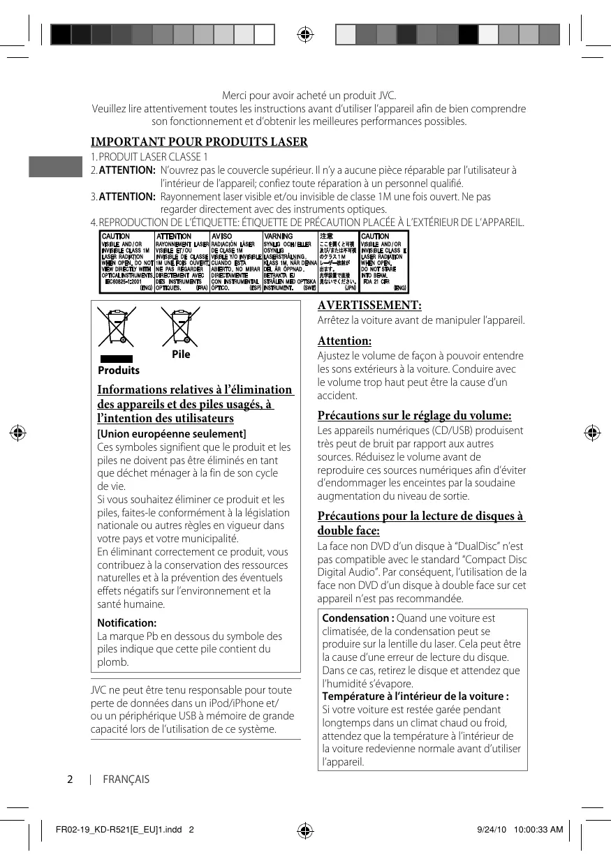 Arrêtez la voiture avant de manipuler l’appareil. Attention: Pile Produits Informations relatives à l’élimination des appareils et des piles usagés, à l’intention des utilisateurs [Union européenne seulement] Ces symboles signifient que le produit et les piles ne doivent pas être éliminés en tant que déchet ménager à la fin de son cycle de vie. Si vous souhaitez éliminer ce produit et les piles, faites-le conformément à la législation nationale ou autres règles en vigueur dans votre pays et votre municipalité. En éliminant correctement ce produit, vous contribuez à la conservation des ressources naturelles et à la prévention des éventuels effets négatifs sur l’environnement et la santé humaine. Notification: La marque Pb en dessous du symbole des piles indique que cette pile contient du plomb. JVC ne peut être tenu responsable pour toute perte de données dans un iPod/iPhone et/ ou un périphérique USB à mémoire de grande capacité lors de l’utilisation de ce système.