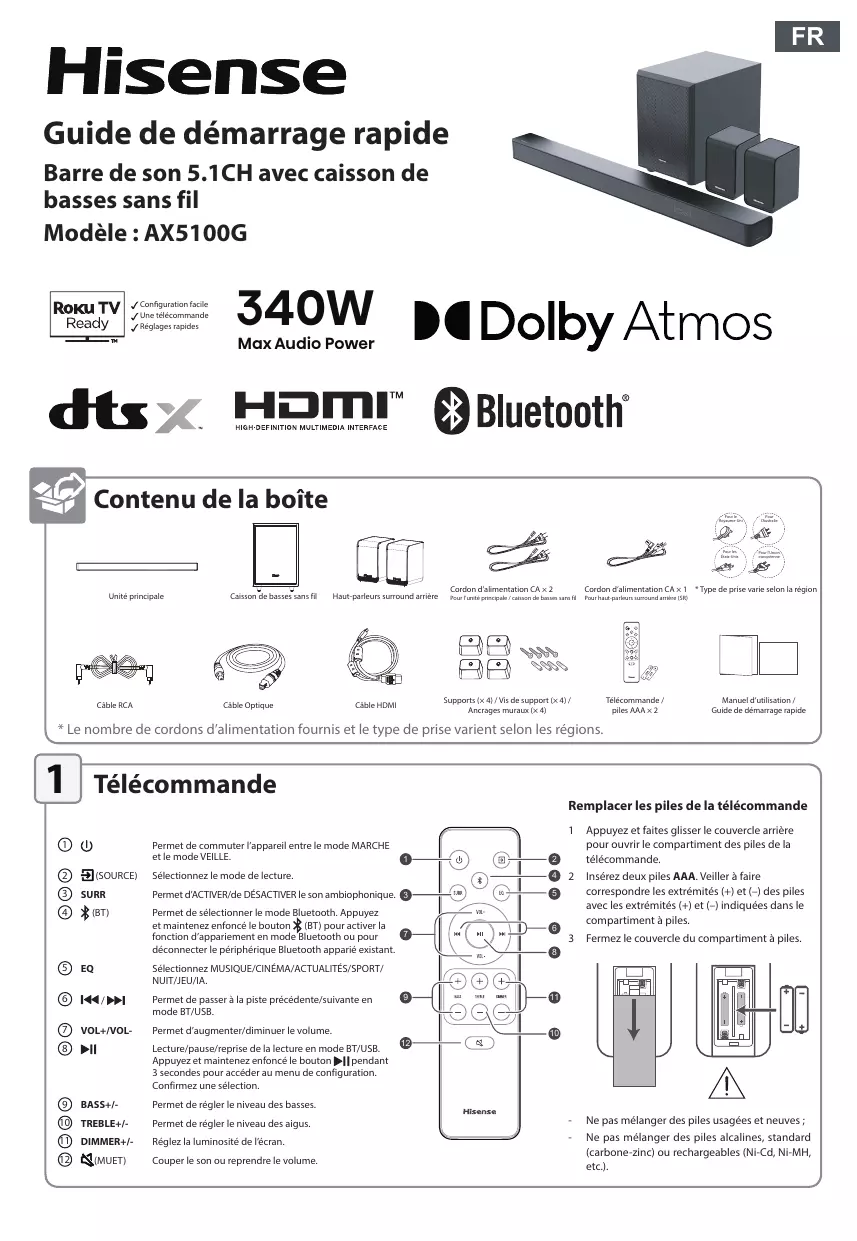 FR Guide de démarrage rapide Barre de son 5.1CH avec caisson de basses sans fil Modèle : AX5100G Configuration facile Une télécommande Réglages rapides