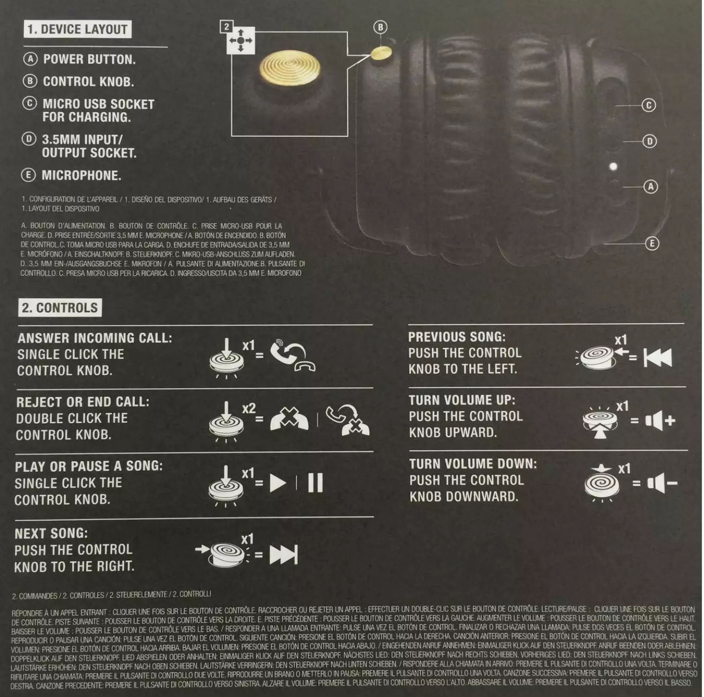 -Pour allumer le casque, pousser sur le bouton noir pour 4 secondes jusqu'à de que la lumière blanche allume -Pour éteindre le casque, pousser sur le bouton noire pour 4 secondes jusqu'à ce que la lumière change au rouge -Pour connecter le casque à Bluetooth allumer le casque. Une fois allumer pousser sur le bouton noir deux fois pour que la lumière change au bleu et clignote. Dès que la lumière clignote blue, vous pouvez découvrire (scan) le casque avec le téléphone ou l'ordinateur et connecté (pair) les deux appareils ensemble. Pour recharger brancher le câble micro USB dans un ordinateur allumé ou une prise de courant avec un adapteur USB. -Si la lumière du casque est blanche: le casque est complètement chargé -Si la lumière est rouge: le casque est en charge -Si la lumière clignote rouge: le casque n'aura plus de batterie très bientôt (moins de 25% de charge) La batterie prend une moyenne de deux heures pour charger complètement ce qui donne une charge pour 8 heures d'écoute environ. Vous pouvez utiliser le casque branché avec le câble audio 3.5 mm directement dans l'appareil si votre casque n'a plus de charge comme un casque non bluetooth. Instruction comment le bouton de contrôle fonctionne (le bouton doré): -Quand le téléphone sonne Pousser 1 fois: Répondre au téléphone Pousser 2 fois rapide: Rejeter ou raccrocher l'appel -Pour écouter de la musique: pousser 1 fois: Faire jouer la musique ou pauser si la musique joue déjà Tirer le bouton à droite: Faire jouer la prochaine chanson Tirer le bouton à gauche: faire rejouer la dernière chanson Tirer le bouton vers le haut: Monter le volume Tirer le bouton vers le bas: Baisser le volume