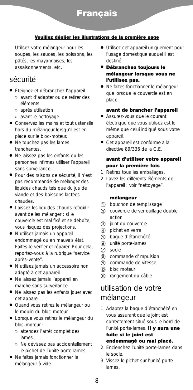 Utilisez cet appareil uniquement pour l’usage domestique auquel il est destiné. Débranchez toujours le mélangeur lorsque vous ne l’utilisez pas. Ne faites fonctionner le mélangeur que lorsque le couvercle est en place. avant de brancher l’appareil Assurez-vous que le courant électrique que vous utilisez est le même que celui indiqué sous votre appareil. Cet appareil est conforme à la directive 89/336 de la C.E.