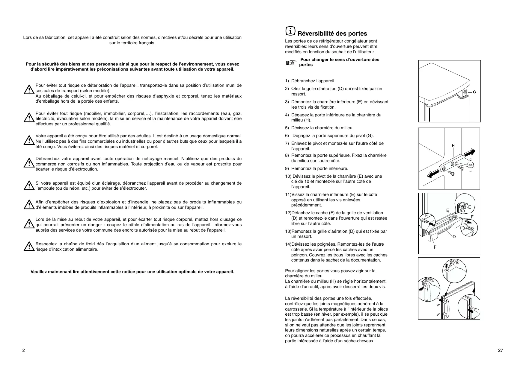 9HXLOOH]PDLQWHQDQWOLUHDWWHQWLYHPHQWFHWWHQRWLFHSRXUXQHXWLOLVDWLRQRSWLPDOHGHYRWUHDSSDUHLO Réversibilité des portes Les portes de ce réfrigérateur congélateur sont réversibles: leurs sens d’ouverture peuvent être modifiés en fonction du souhait de l’utilisateur.