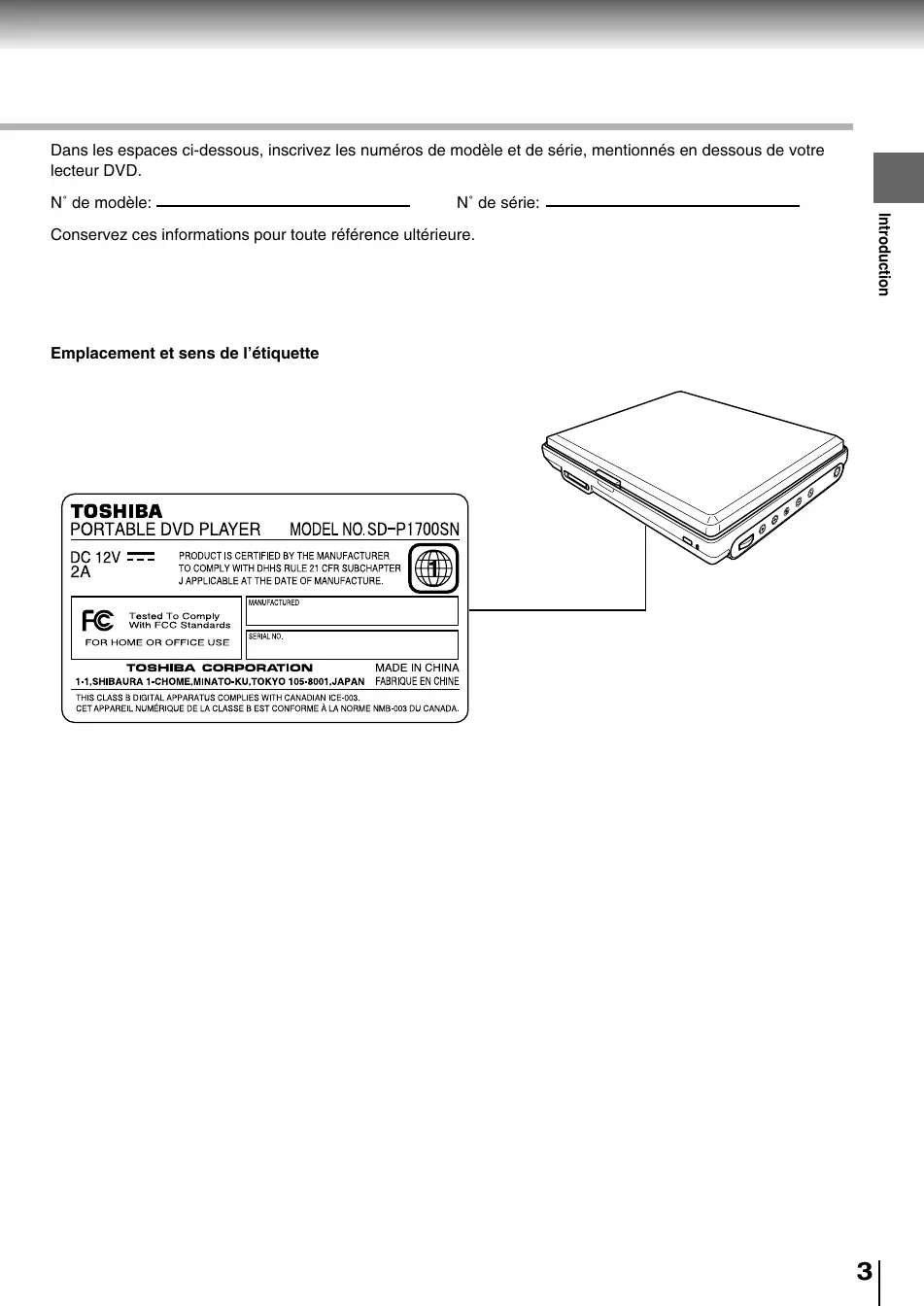 Dans les espaces ci-dessous, inscrivez les numérios de modèle et de série, mentionnés en dessous de votre lecteur DVD.