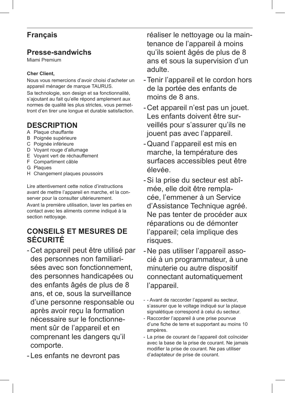 Français Presse-sandwichs Miami Premium Cher Client, Nous vous remercions d’avoir choisi d’acheter un appareil ménager de marque TAURUS. Sa technologie, son design et sa fonctionnalité, s’ajoutant au fait qu’elle répond amplement aux normes de qualité les plus strictes, vous permettront d’en tirer une longue et durable satisfaction. DESCRIPTION