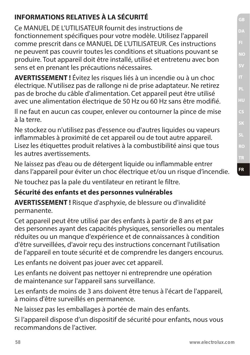 électrique. N'utilisez pas de rallonge ni de prise adaptateur. Ne retirez pas de broche du câble d'alimentation. Cet appareil peut être utilisé avec une alimentation électrique de 50 Hz ou 60 Hz sans être modifié. Il ne faut en aucun cas couper, enlever ou contourner la pince de mise à la terre. Ne stockez ou n'utilisez pas d'essence ou d'autres liquides ou vapeurs inflammables à proximité de cet appareil ou de tout autre appareil. Lisez les étiquettes produit relatives à la combustibilité ainsi que tous les autres avertissements. Ne laissez pas d’eau ou de détergent liquide ou inflammable entrer dans l’appareil pour éviter un choc électrique et/ou un risque d’incendie. Ne touchez pas la pale du ventilateur en retirant le filtre. Sécurité des enfants et des personnes vulnérables AVERTISSEMENT ! Risque d'asphyxie, de blessure ou d'invalidité permanente. Cet appareil peut être utilisé par des enfants à partir de 8 ans et par des personnes ayant des capacités physiques, sensorielles ou mentales réduites ou un manque d'expérience et de connaissances à condition d'être surveillées, d'avoir reçu des instructions concernant l'utilisation de l'appareil en toute sécurité et de comprendre les dangers encourus. Les enfants ne doivent pas jouer avec cet appareil. Les enfants ne doivent pas nettoyer ni entreprendre une opération de maintenance sur l'appareil sans surveillance. Les enfants de moins de 3 ans doivent être tenus à l'écart de l'appareil, à moins d'être surveillés en permanence. Ne laissez pas les emballages à portée de main des enfants. Si l’appareil dispose d’un dispositif de sécurité pour enfants, nous vous recommandons de l’activer. 58