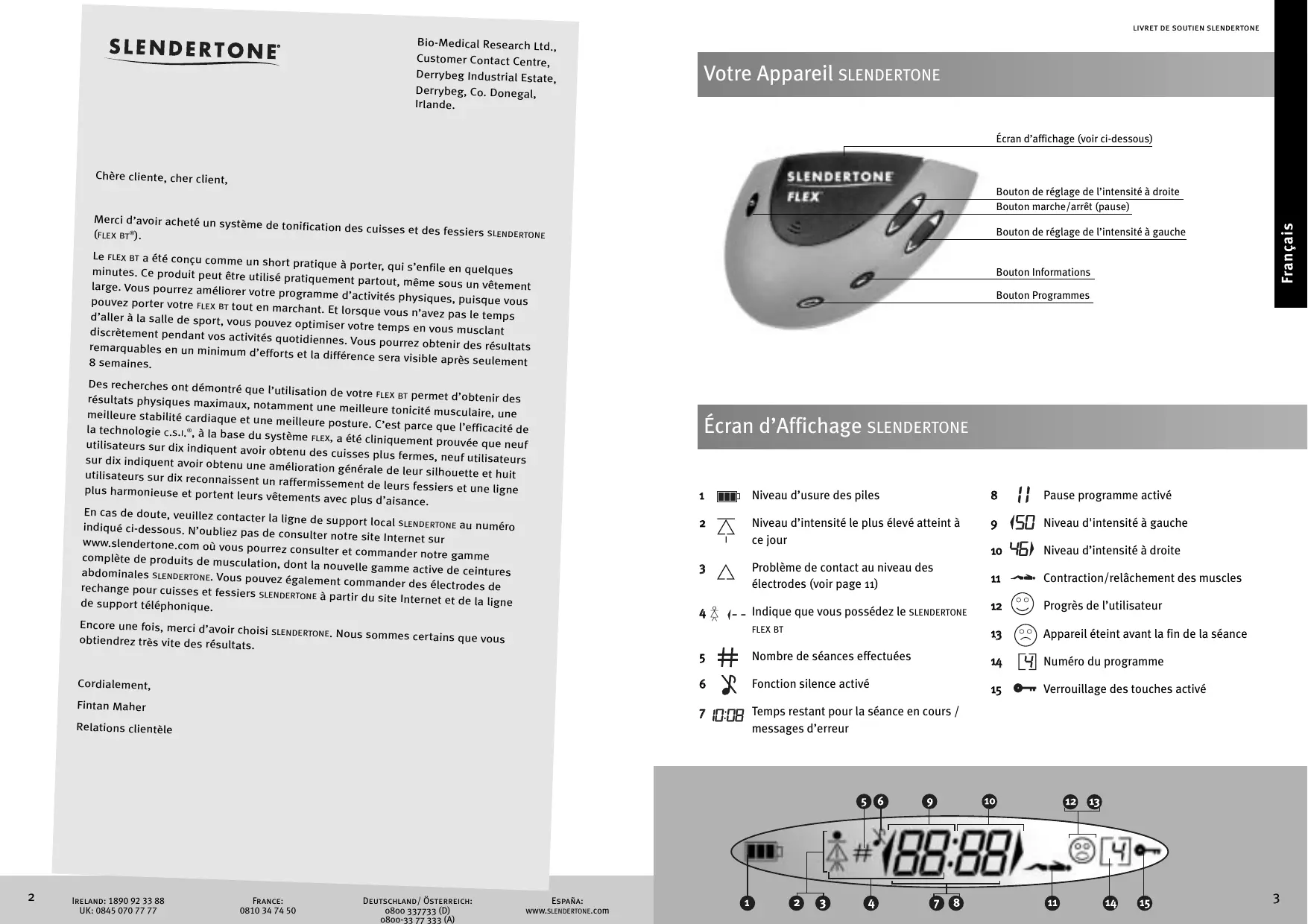 www.slendertone.com Designed by & Manufactured for: Bio-Medical Research Ltd., Derrybeg Industrial Estate, Derrybeg, Co. Donegal, Ireland. Copyright © 2003 Bio-Medical Research Ltd. All rights reserved. SLENDERTONE, SLENDERTONE flex, flex, bt and c.s.i. are trademarks of Bio-Medical Research Ltd. Patents pending. UK Design Number: 3002342, SLENDERTONE is a division of Bio-Medical Research Ltd. part number: 2400-8705 rev.: 1 issue date: 06/03 Support Pack livret de soutien slendertone Bio-Medical Research Ltd., Customer Contact Centre, Derrybeg Industrial Estate, Derrybeg, Co. Donegal, Irlande. Votre Appareil SLENDERTONE Écran d’affichage (voir ci-dessous) Chère cliente, cher client, Merci d’avoir acheté un système de tonification des cuisses et des fessiers SLENDERTONE (FLEX BT®). Bouton de réglage de l’intensité à gauche Le FLEX BT a été conçu comme un short pratique à porter, qui s’enf ile en quelques minutes. Ce produit peut être utilis é pratiquement partout, même sous un vêtement large. Vous pourrez améliorer votre programme d’activités physique s, puisque vous pouvez porter votre FLEX BT tout en marchant. Et lorsque vous n’ave z pas le temps d’aller à la salle de sport, vous pouvez optimiser votre temps en vous musclant discrètement pendant vos activ ités quotidiennes. Vous pourrez obtenir des résultats remarquables en un minimum d’efforts et la différence sera visib le après seulement 8 semaines. Des recherches ont démontré que l’utilisation de votre FLEX BT perm et d’obtenir des résultats physiques maximaux, notamment une meilleure tonic ité musculaire, une meilleure stabilité cardiaque et une meilleure posture. C’est parc e que l’efficacité de la technologie C.S.I.®, à la base du système FLEX, a été cliniquem ent prouvée que neuf utilisateurs sur dix indiquent avoir obtenu des cuisses plus fermes, neuf utilisateurs sur dix indiquent avoir obtenu une amélioration générale de leur silhouette et huit utilisateurs sur dix reconnaissen t un raffermissement de leurs fessi ers et une ligne plus harmonieuse et portent leurs vêtements avec plus d’aisance En cas de doute, veuillez contacter la ligne de support local SLENDERTON E au numéro indiqué ci-dessous. N’oubliez pas de consulter notre site Internet sur www.slendertone.com où vous pourrez consulter et commande r notre gamme complète de produits de musc ulation, dont la nouvelle gamme active de ceintures abdominales SLENDERTONE. Vous pouvez également commander des électrodes de rechange pour cuisses et fessi ers SLENDERTONE à partir du site Internet et de la ligne de support téléphonique. Encore une fois, merci d’avoir chois i SLENDERTONE. Nous sommes certa ins que vous obtiendrez très vite des résultats