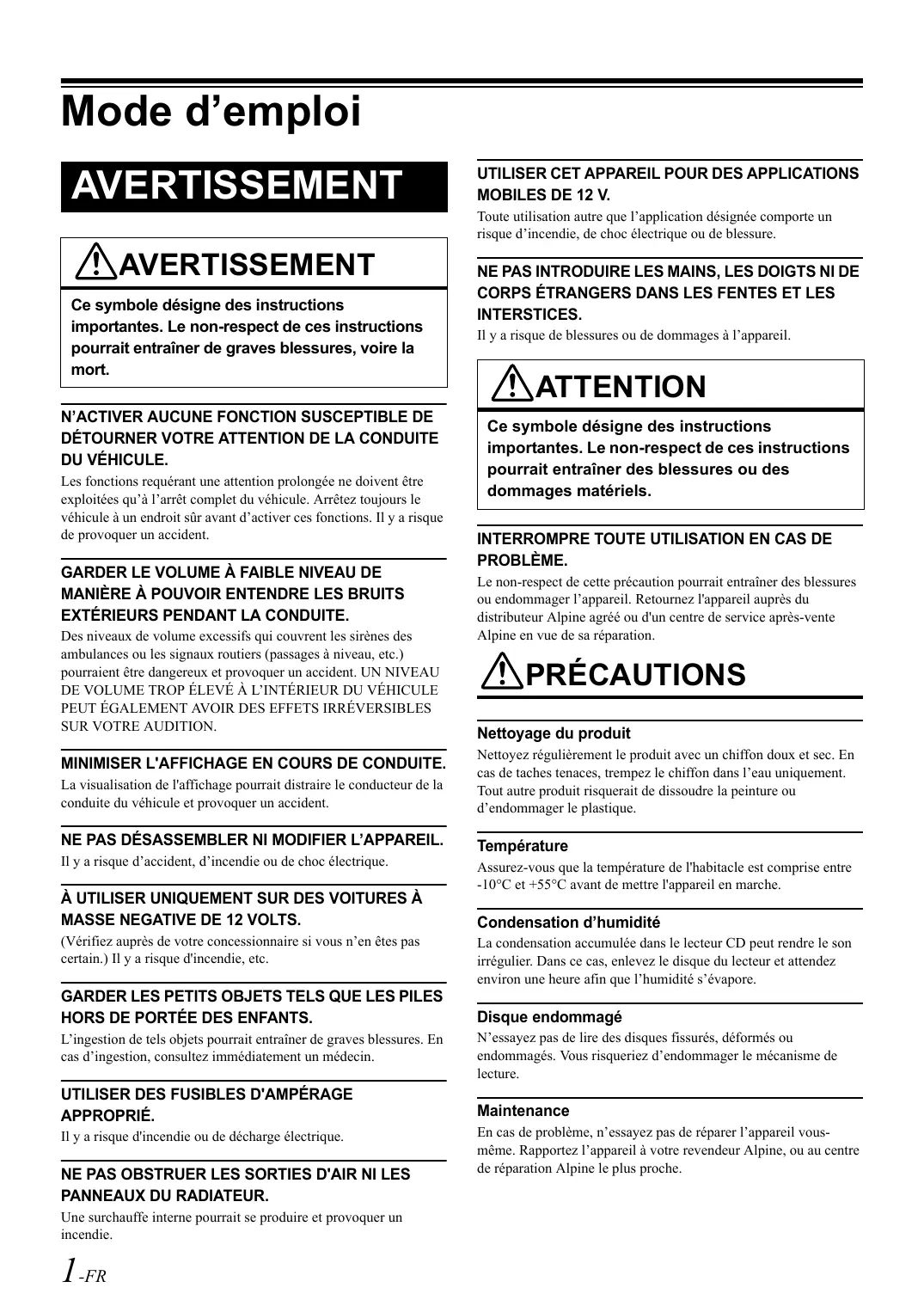 APPROPRIÉ. Il y a risque d'incendie ou de décharge électrique. NE PAS OBSTRUER LES SORTIES D'AIR NI LES PANNEAUX DU RADIATEUR. Une surchauffe interne pourrait se produire et provoquer un incendie. 1-FR Assurez-vous que la température de l'habitacle est comprise entre -10°C et +55°C avant de mettre l'appareil en marche. Condensation d’humidité La condensation accumulée dans le lecteur CD peut rendre le son irrégulier. Dans ce cas, enlevez le disque du lecteur et attendez environ une heure afin que l’humidité s’évapore. Disque endommagé N’essayez pas de lire des disques fissurés, déformés ou endommagés. Vous risqueriez d’endommager le mécanisme de lecture. Maintenance En cas de problème, n’essayez pas de réparer l’appareil vousmême. Rapportez l’appareil à votre revendeur Alpine, ou au centre de réparation Alpine le plus proche. Ne jamais tenter d’effectuer les opérations suivantes Emplacement d'installation Ne saisissez pas ou ne retirez pas le disque pendant qu’il est introduit dans le lecteur par le mécanisme de chargement automatique. N'essayez pas d’insérer un disque dans l’appareil quand celui-ci est éteint. Veillez à ne pas installer cet appareil dans un endroit exposé aux conditions suivantes :