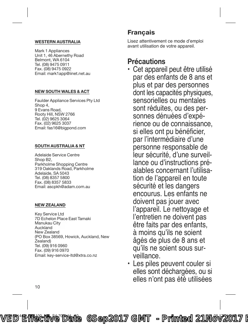 Adelaide Service Centre Shop B2, Parkholme Shopping Centre 319 Oaklands Road, Parkholme Adelaide, SA 5043 Tel. (08) 8357 5800 Fax. (08) 8357 5833 Email: ascpkh@adam.com.au NEW ZEALAND Key Service Ltd 7D Echelon Place East Tamaki Manukau City Auckland New Zealand (PO Box 38569, Howick, Auckland, New Zealand) Tel. (09) 916 0960 Fax. (09) 916 0970 Email: key-service-ltd@xtra.co.nz Lisez attentivement ce mode d’emploi avant utilisation de votre appareil. Précautions