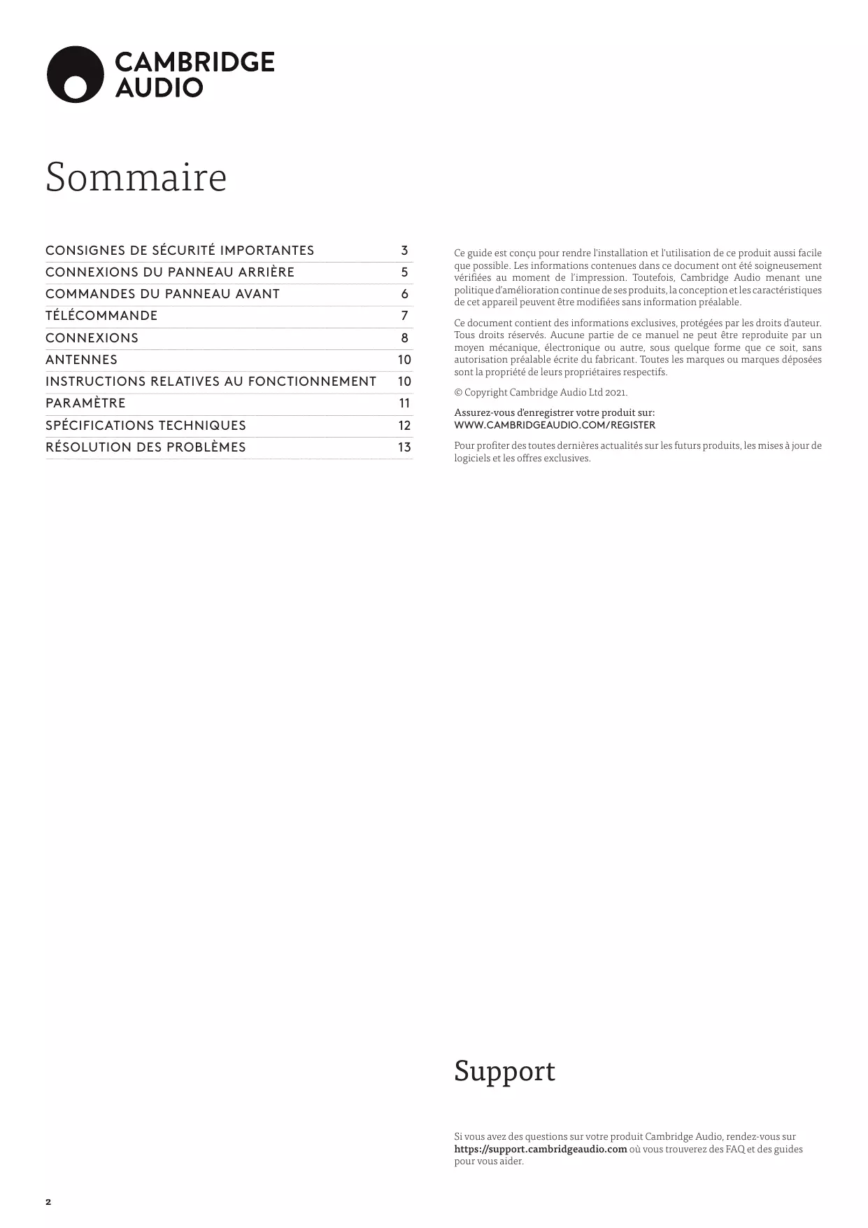 Si vous avez des questions sur votre produit Cambridge Audio, rendez-vous sur https://support.cambridgeaudio.com où vous trouvrez des FAQ et des guides pour vous aider.