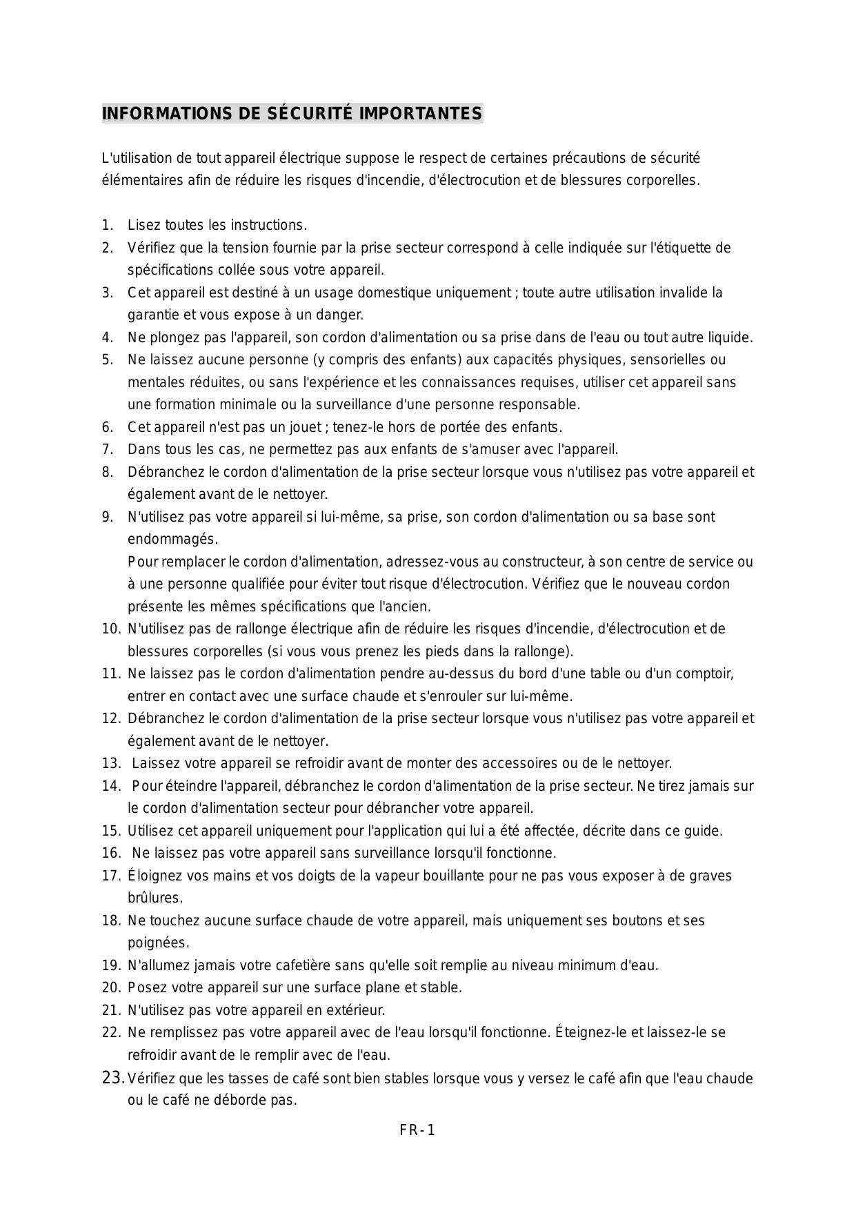 AVERTISSEMENTS : z N'utilisez pas votre appareil à proximité d'une baignoire, d'un évier ou de toute autre source d'eau. z Si votre appareil tombe dans l'eau, n'essayez pas de le récupérer. Débranchez immédiatement son cordon d'alimentation de la prise secteur, évacuez l'eau et uniquement ensuite récupérez votre appareil. Ne l'utilisez pas avant de l'avoir fait vérifié par un technicien qualifié. z Les surfaces accessibles s'échauffent en cours de fonctionnement. Portez des gants et touchez uniquement les poignées. IMPORTANT Vérifiez que la tension requise, indiquée sur l'étiquette de spécifications fixée en dessous de l'appareil, correspond à celle fournie par votre installation électrique. Si ce n'est pas le cas, ne branchez pas votre appareil. Ne posez pas votre appareil sur une source de chaleur, par exemple sur une cuisinière ou dans un four. Remplissez votre cafetière uniquement avec de l'eau du robinet.